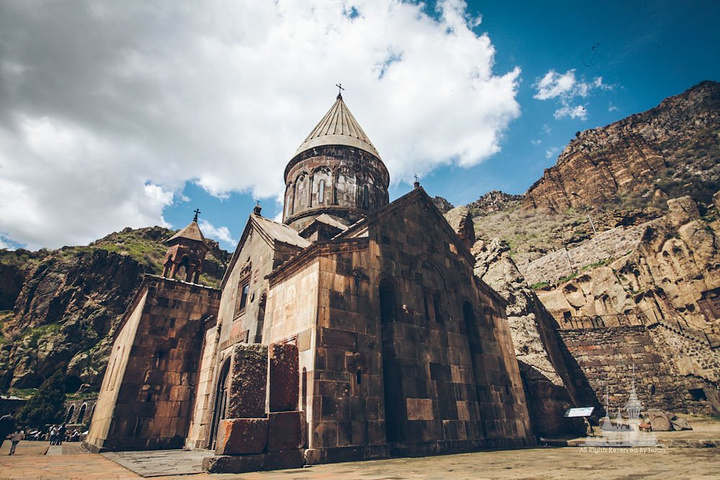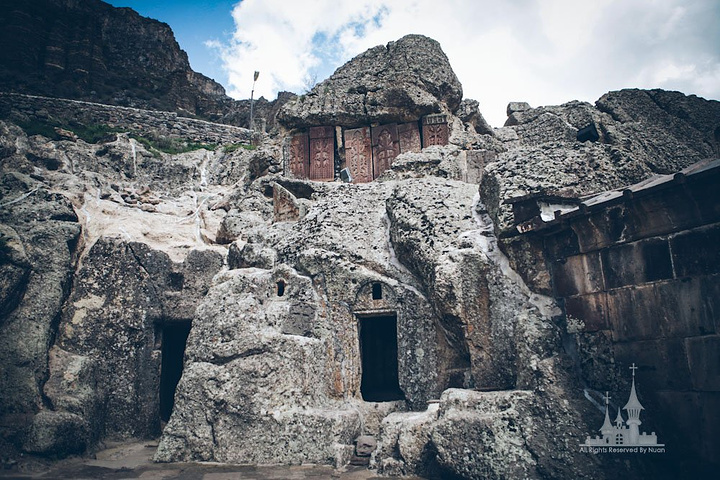从下车点去到Geghard的一路都是山路,天气好的时候风景真的很美,而且Geghard建立于山崖之间,本身也有在山体凿出来的几处布局,远远看去仿佛就是一座与山峦融为一体的建筑。