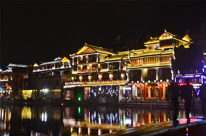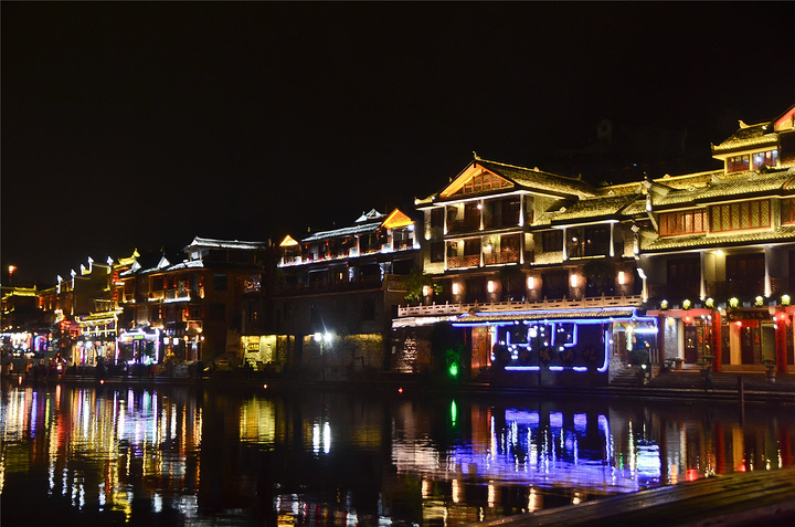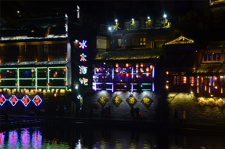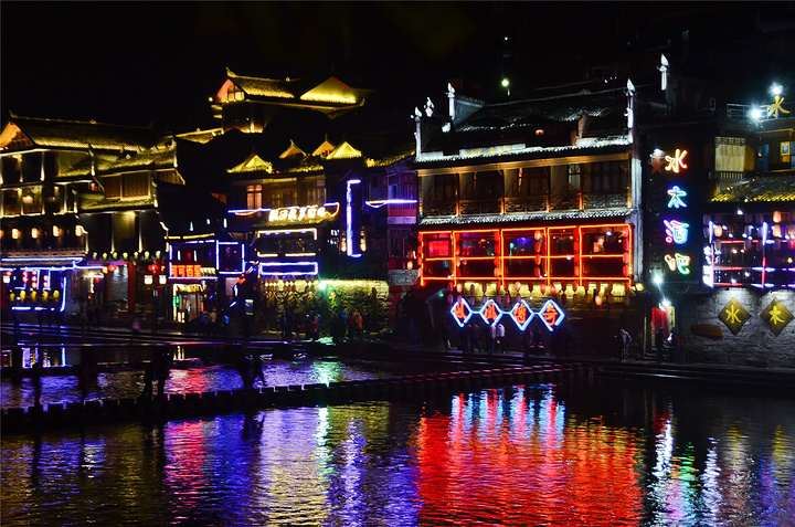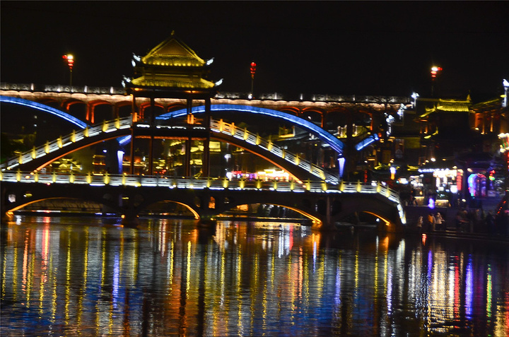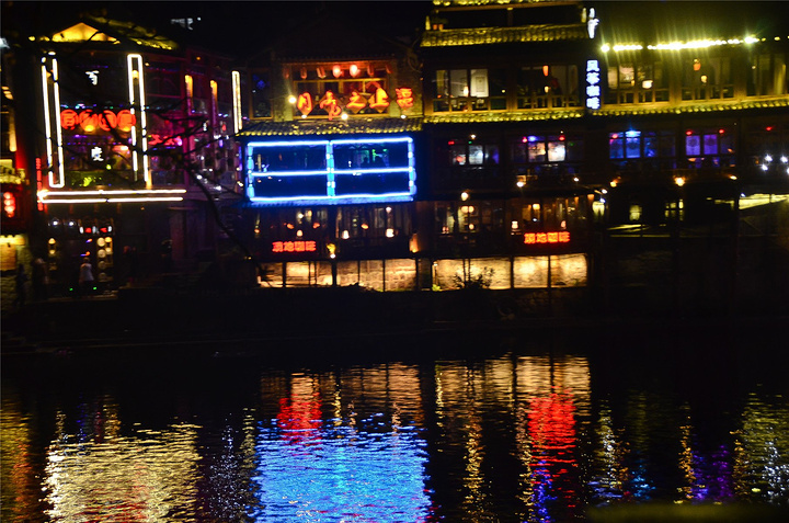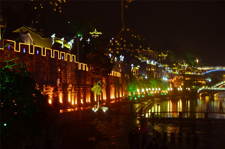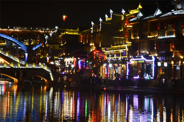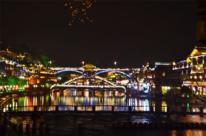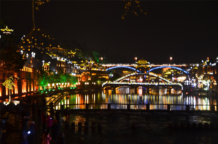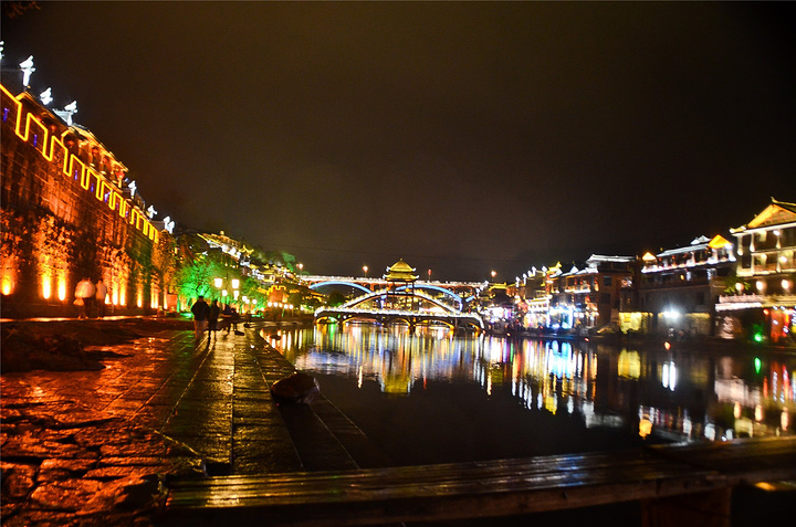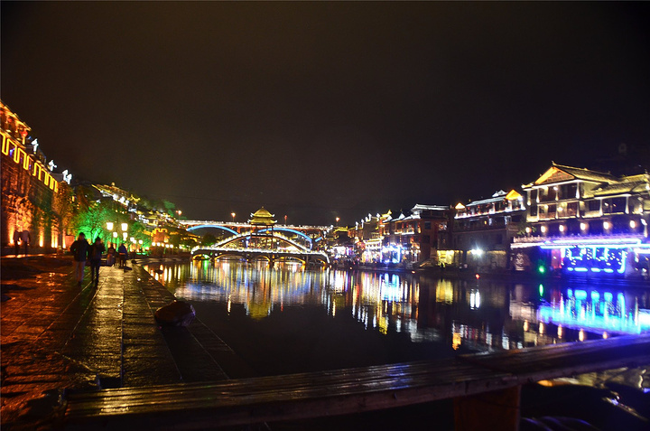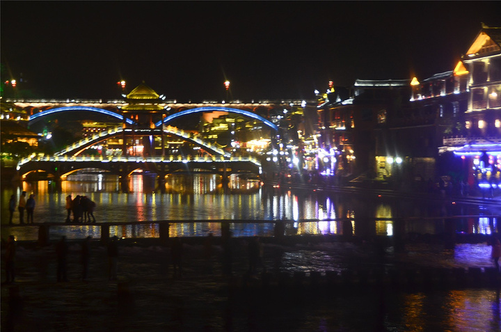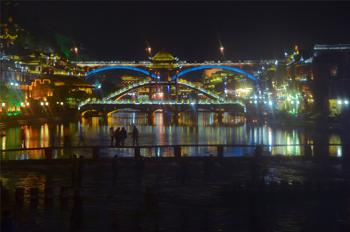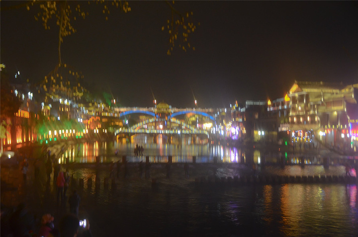 原以为凤凰基本就已经走完了,谁知走过古城墙的城门又是一片新景象,我看到了【沱江跳岩】!!我看到了“沱江跳岩”!!这才是我印象的【凤凰古城】啊,我怎么把你忘了。和【虹桥】的那边相比,这里又是另一个世界,各种音响的轰鸣声,无数镁光灯闪烁,扫来扫去。水中灯光的倒影就随着音浪在颤动,看得听得无比过瘾。加之雨点随着江风打在脸,凉凉的,但很舒服。本来已经收起三脚架,又装了回来。导游之前和我们说【凤凰古城】非常小,用很短时间就可以走一遍,我不赞同,我觉得古城还蛮大的,即便沿着江边走一圈,长着一双飞毛腿也要一个小时吧。
