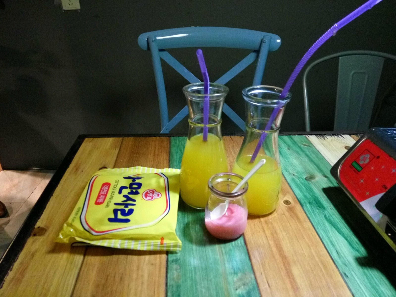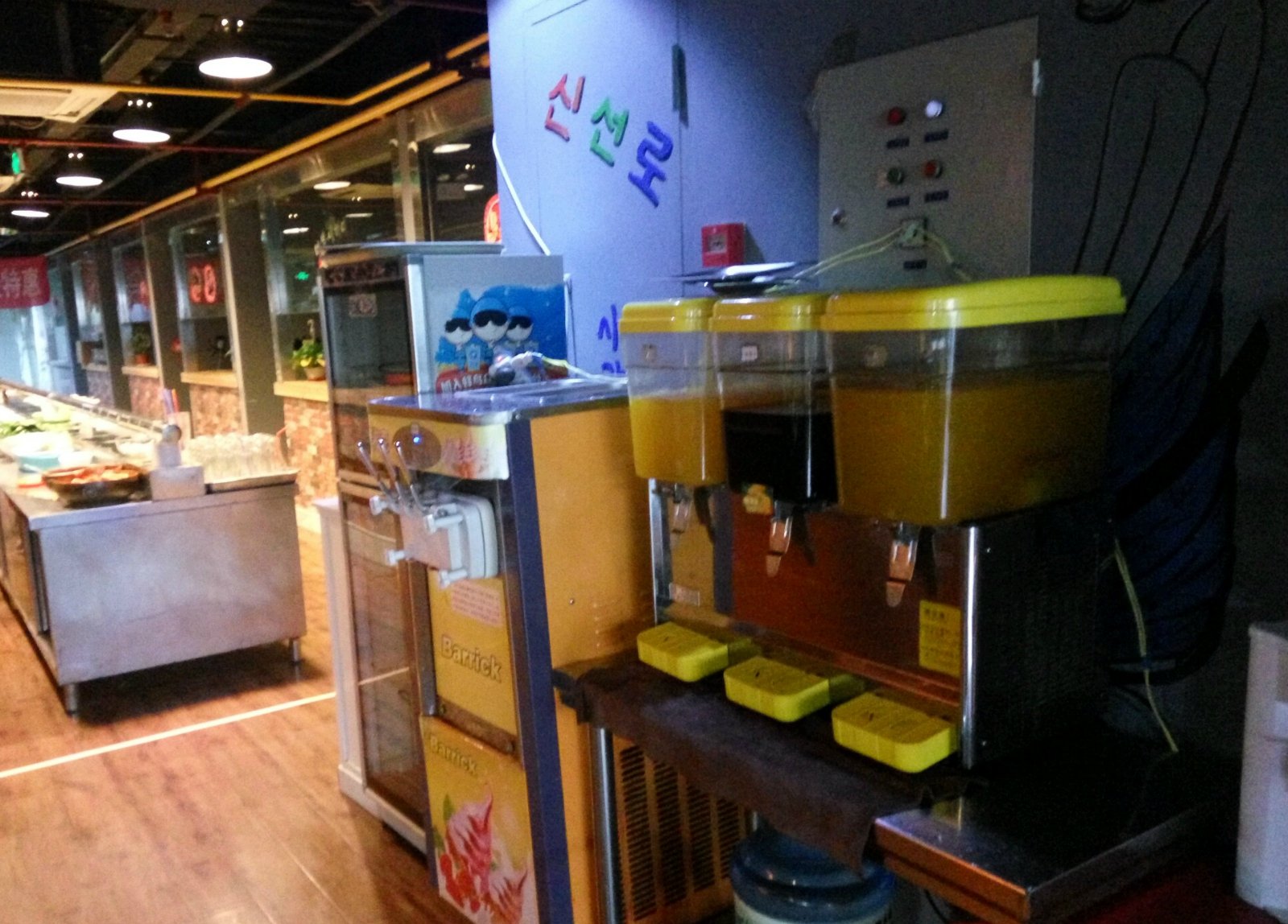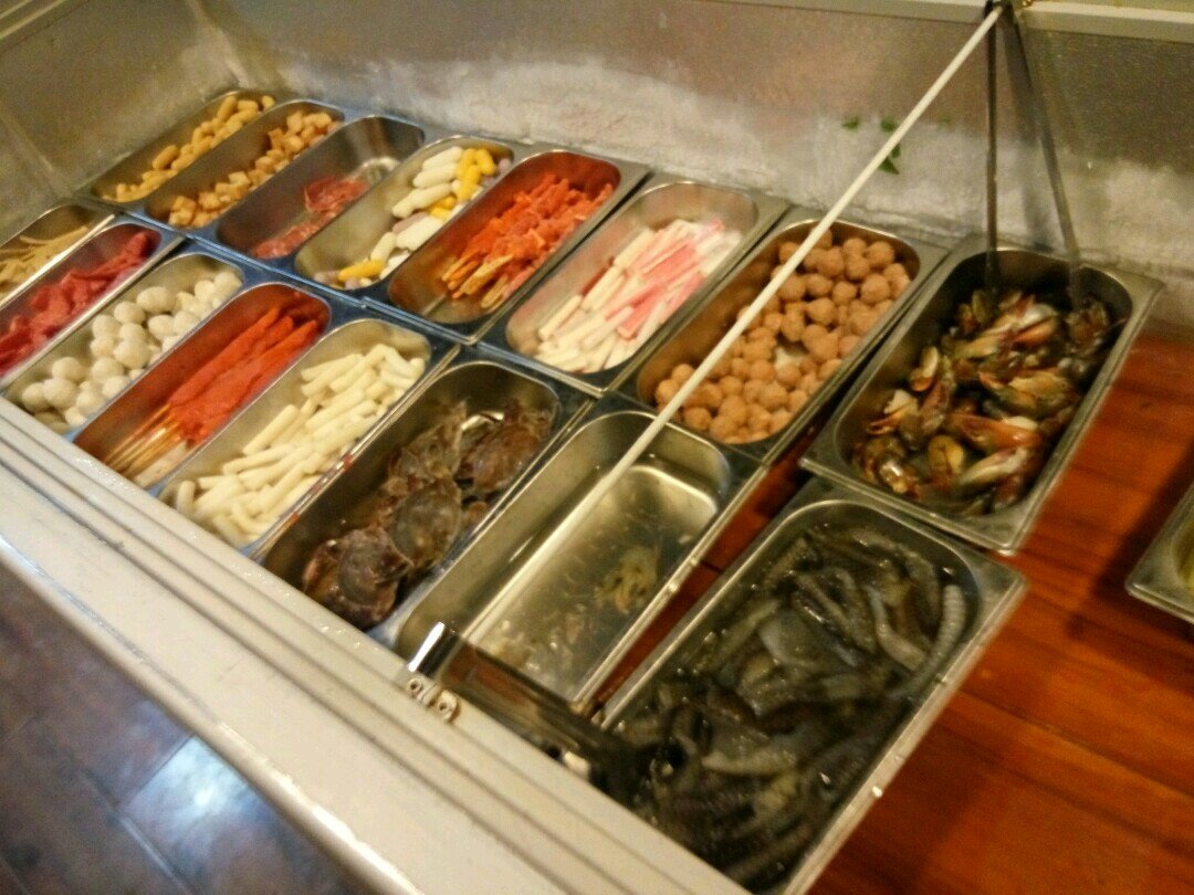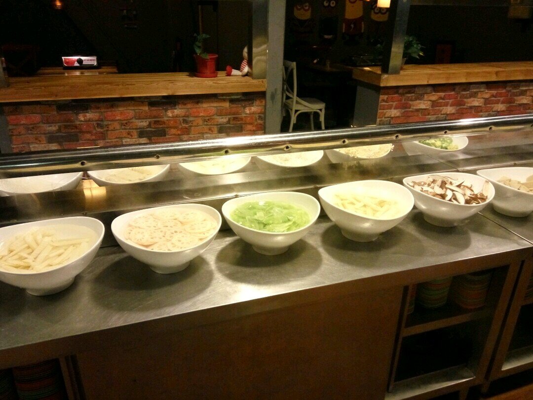 ③菜品介绍:菜品分为蔬菜区和肉食区,蔬菜区有,生菜、金针菇、白菜、香菇、面筋、山药、莲菜、莴苣、西蓝花等20余种,食材皆为现切,新鲜。盛放与白色的碗中,水雾机的运行,使得食材更加能够保持新鲜度。肉食区有骨肉相连、螃蟹、蟹爪、虾、年糕棒、肉丸、培根等18种肉食。可以说菜品种类齐全。小食品有:果冻、冰激凌(注意:需要冰激凌机的显示数字为90的时候再去接,不然接到的会是冰激凌水)。饮品:为果汁类型,有芒果、柳橙汁、酸梅三种口味,还有矿泉水。韩式泡面也是不错的美食。