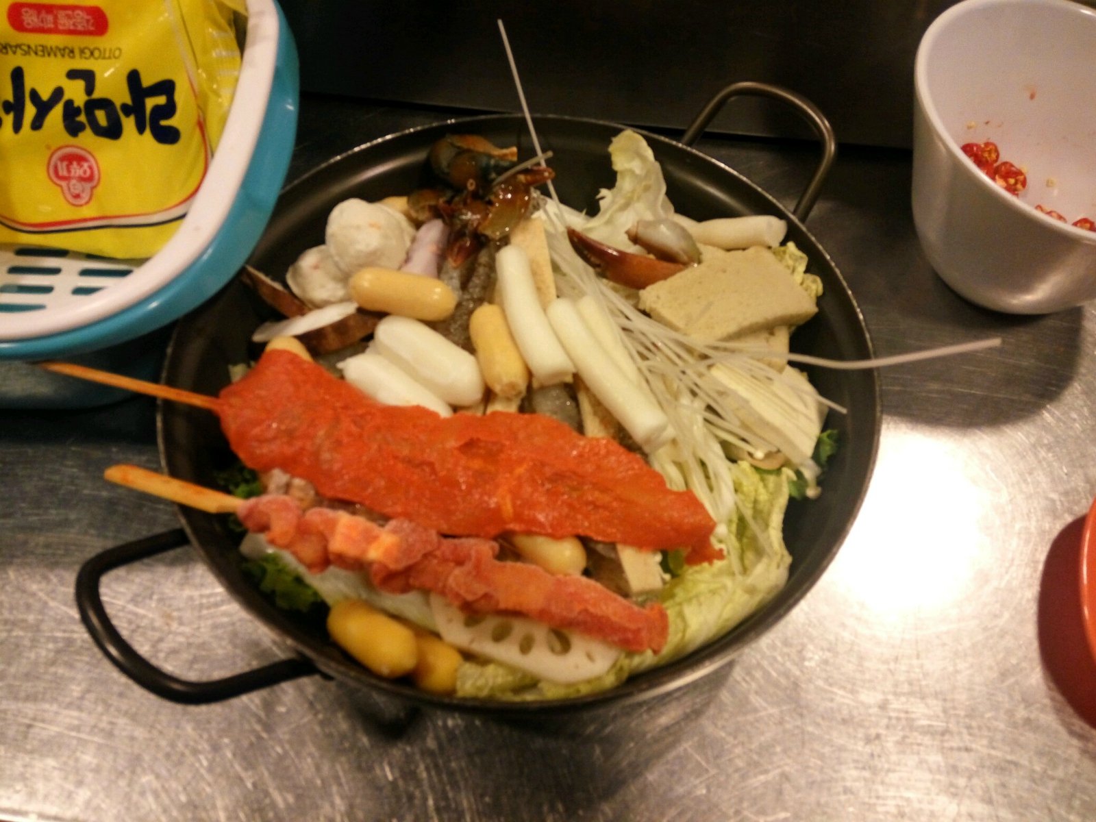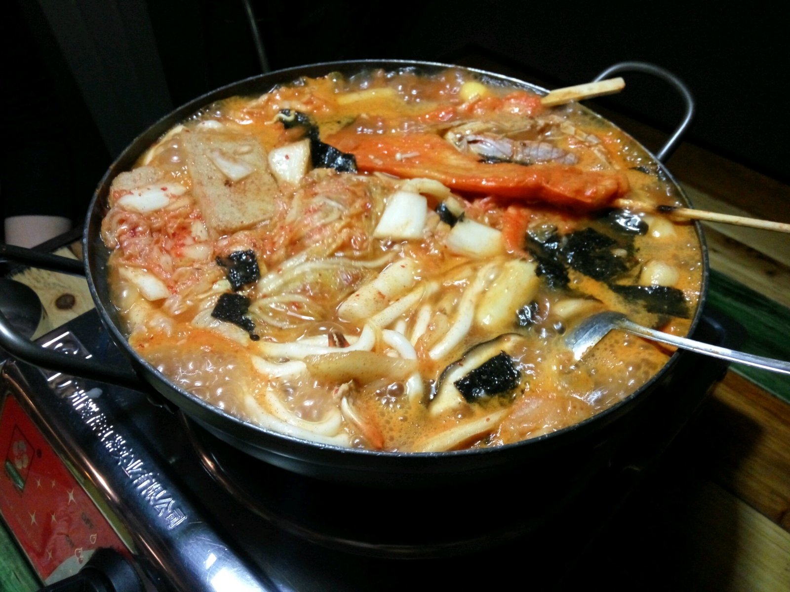 ④价位/性价比;原价48元,团购新客每位24元,第二单为32.5元,因此建议团购。在钟楼这么繁华的地方,菜品如此丰富的条件下,性价比也是比较高的。 ⑤推荐菜:泡菜,泡菜味道酸中带着些辣,辣中有带着点甜。而且泡菜对减肥、清肠、预防成人病有特效。含着人体所需的微元素。 吃法推荐:首先老板会给你一个锅,你就可以拿菜了,不过放菜可是有所讲究的,第一层放些素菜,最后放上生菜打底,然后依次放上你所喜欢吃的蔬菜,蔬菜够了的话,可以再上面放上肉食,最后可以放些芝士年糕。不要拿的太多了,免得煮的时候,沸腾导致烫伤自己。拿好菜后,老板会为你调制,会给你放上辣椒酱、海苔、泡菜,然后加上汤就可以上灶开煮了,泡面最后放在上面。注意当封腾的时候,适当将火关小,并且在吃的过程中,是不是搅拌一下,避免食材粘锅煮焦。