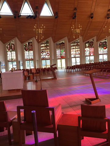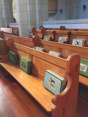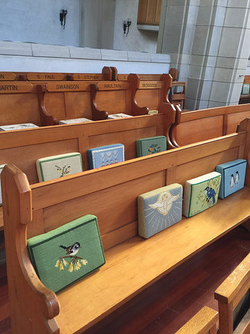我们去的时候,刚巧碰上教堂在装修翻新,一位教堂的工作人员老奶奶亲切地给我们简单讲解了一下,还给了我们一份中文介绍翻译,还很热情地和我们聊了聊中国,很愉快的时光。 教堂里的窗户上是画着各种毛利族和动植物的彩色玻璃,展现了这个国家的历史,很是精致,色彩也艳丽而不俗气。 教堂里的座椅上的靠垫也特别的精美,有不同的图案。完全美丽~~~