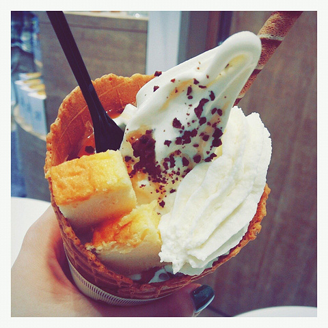 牛乳冰激凌浓郁到不行!里面还有冰冻的芝士蛋糕,淡奶油,巧克力碎,巧克力豆,最底层是布丁,口感很丰富,外面的华夫脆也是点睛之笔!