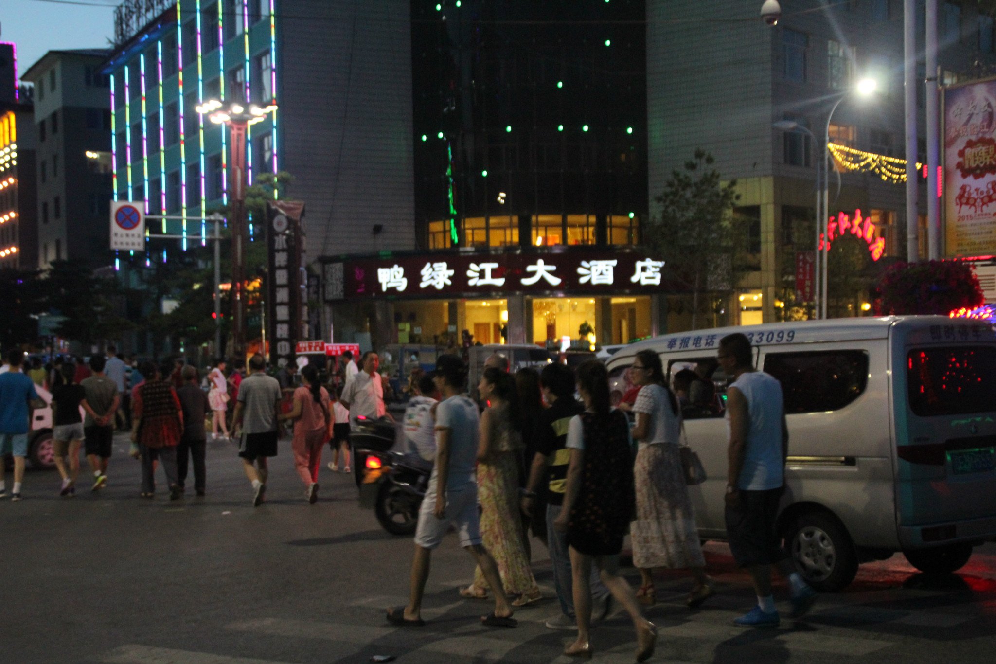 夜幕下的 鸭绿江 , 乘坐 游船 游玩的游客 ,对岸 是 朝鲜的 民居 。休闲 娱乐的 临江 市民