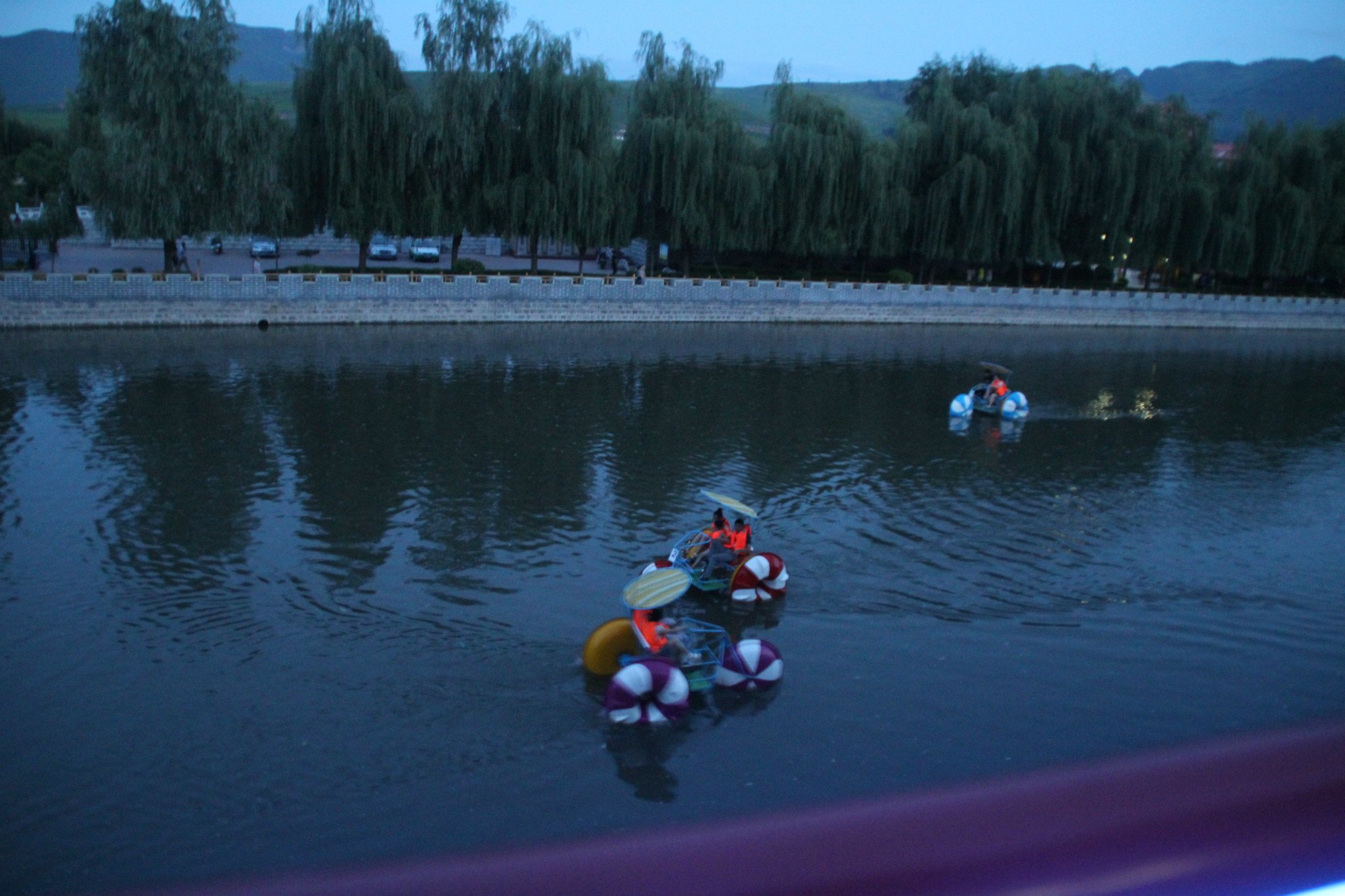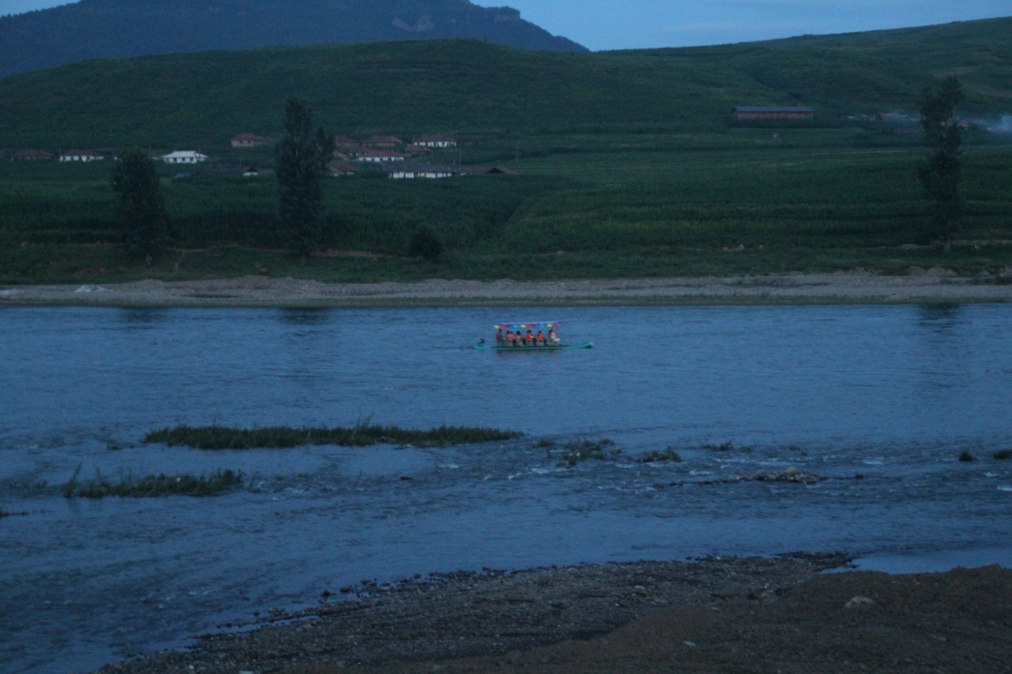 夜幕下的 鸭绿江 , 乘坐 游船 游玩的游客 ,对岸 是 朝鲜的 民居 。