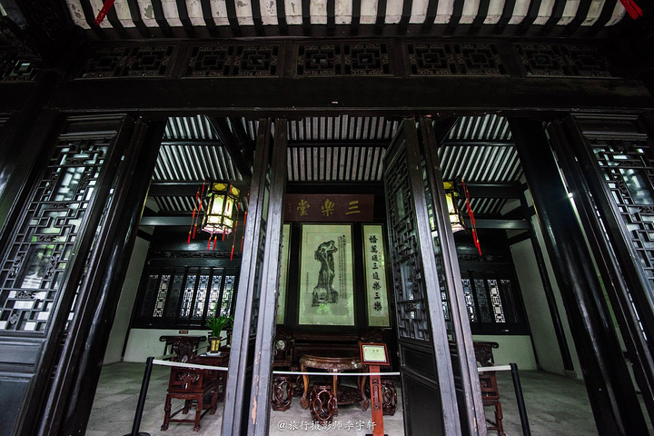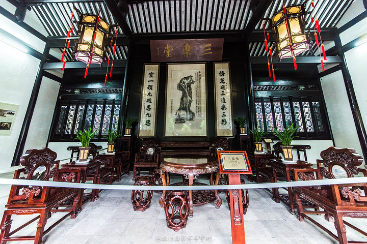 三乐堂为九开间二层楼,前后皆天井,在砖雕门斗上饰飞椽斗拱、隐堂匾额“竹苞松茂”等。所谓的“三乐”,为“仰无愧于天,俯无愧于人,一乐也;父母兄弟俱在,二乐也;聚天下英才而教育之,此三乐也。”