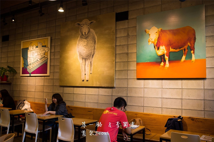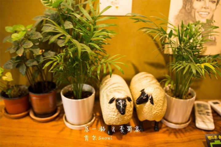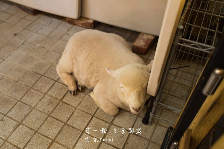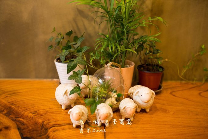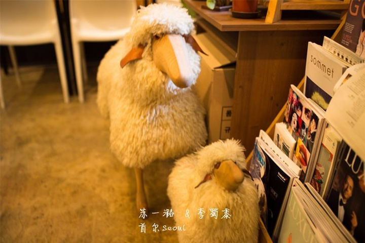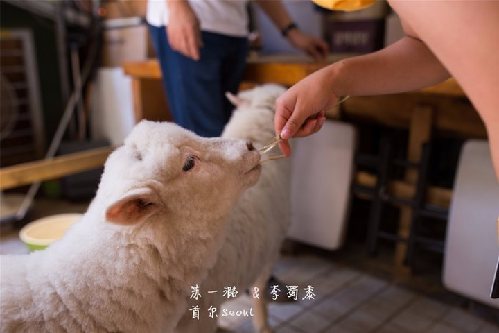 这家咖啡厅从名字就能看出其理念,感谢自然,崇尚自然。这家咖啡厅距离弘大非常近,位于地下一层,店里有两只吃得胖胖的小羊,在这里消费的顾客可以跟小羊一起玩哟~店里除了咖啡,招牌甜点是华夫饼。我们在喝咖啡的时候,就能听到小羊“咩~”“咩~”的叫声,完全原生态。店长大叔长得像宫崎骏,他时不时地去打扫羊窝,给小羊喂食。我们准备离开时,店长让我们进去羊窝给小羊喂草吃。小羊的毛非常柔软,让人止不住想去揉呀!