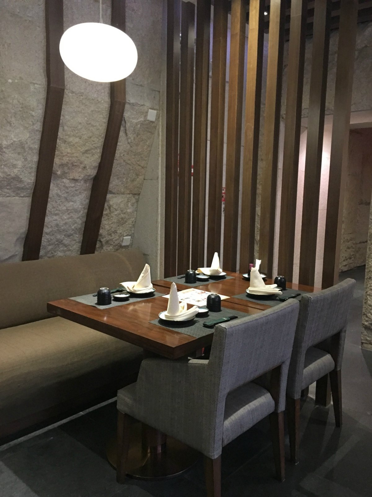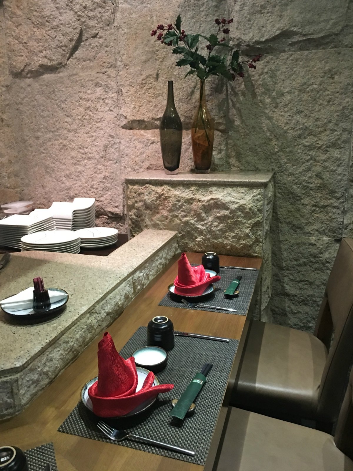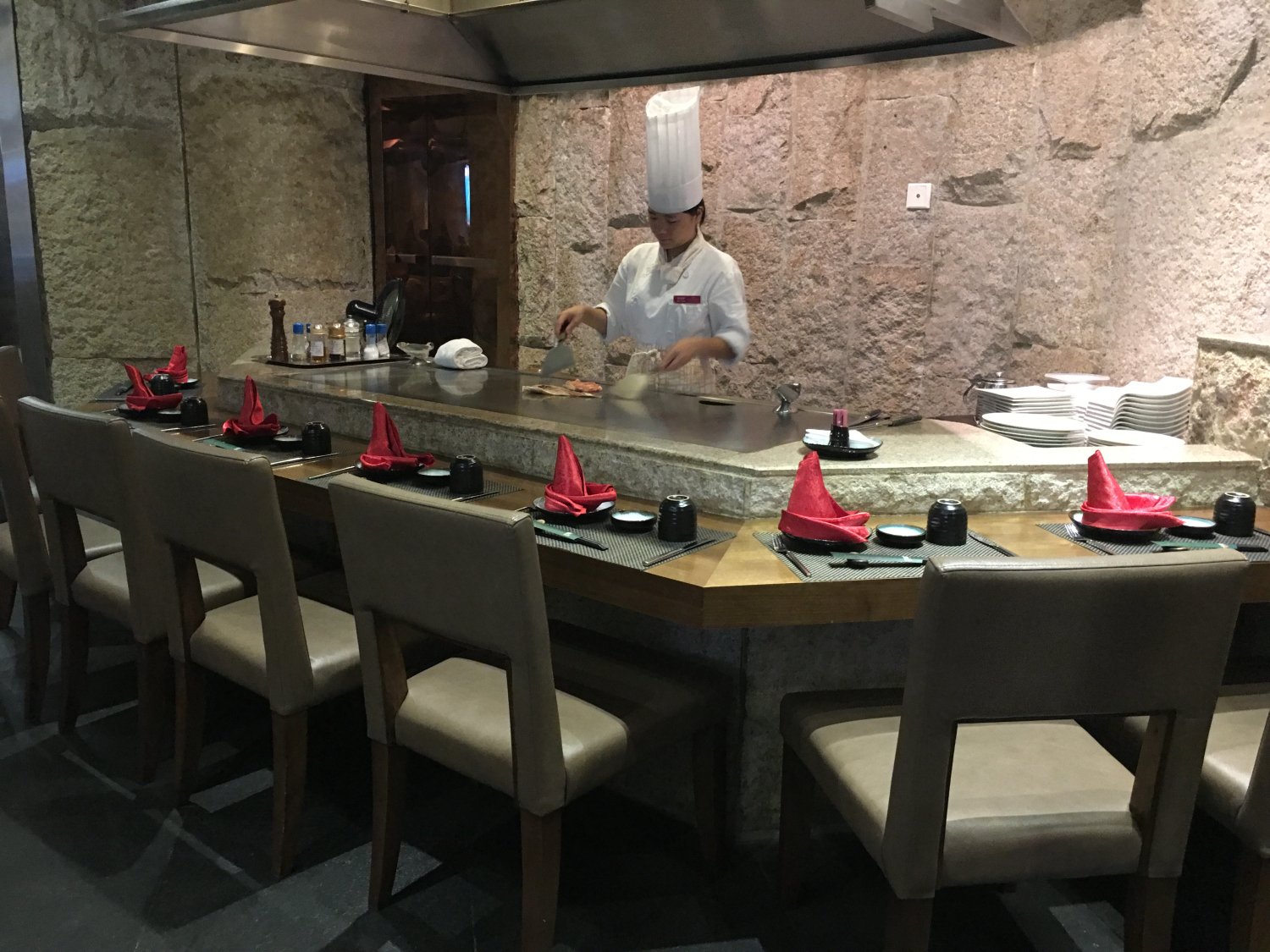 餐厅由于位于负一层,所以餐厅的整体设计比较暗,但是确实很有格调的设计,而且餐厅内部还有提供铁板烧的吧台位置,可以一边享用铁板烧,一边观赏师傅制作铁板烧。