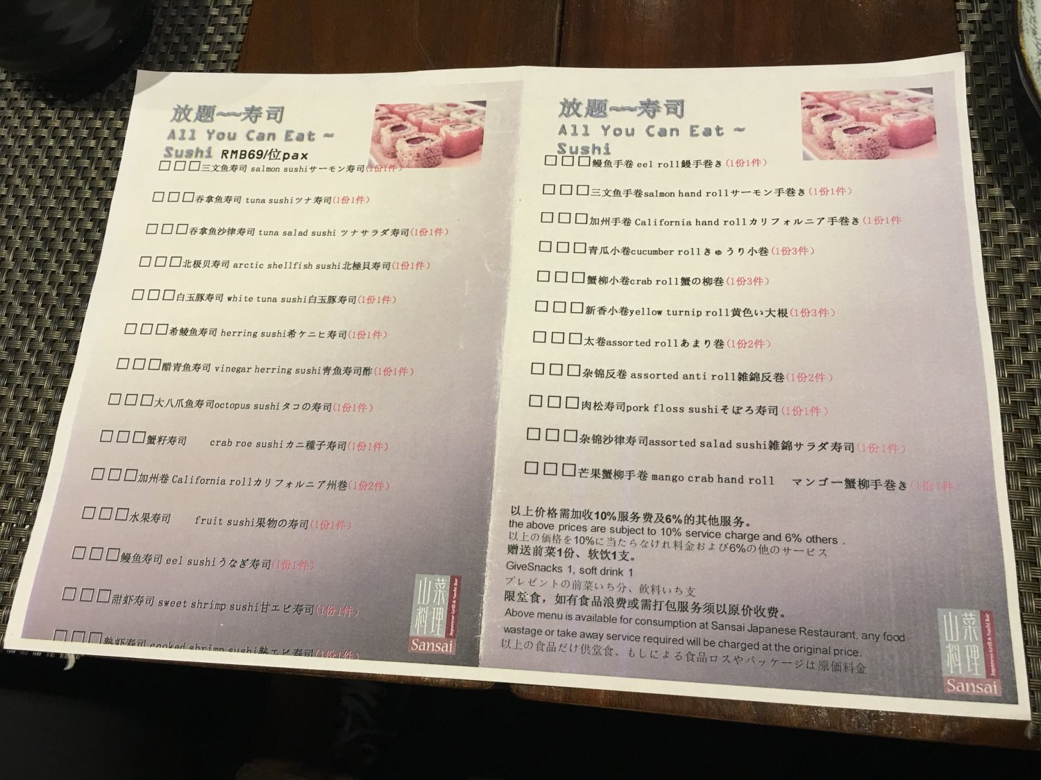 而我们这次主要享用的是它69元一位的寿司自助餐。自助餐的餐单有大约26款寿司,例如三文鱼寿司、鳗鱼寿司、吞拿鱼寿司等等也在其中。