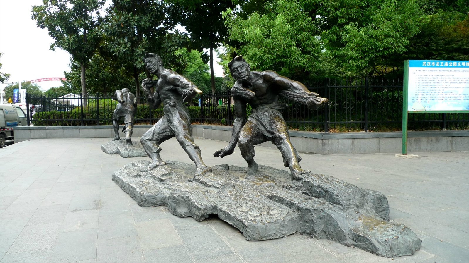 公园大门旁的纤夫雕塑,讲述曾经的汉口码头上的故事