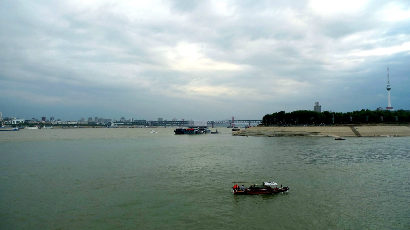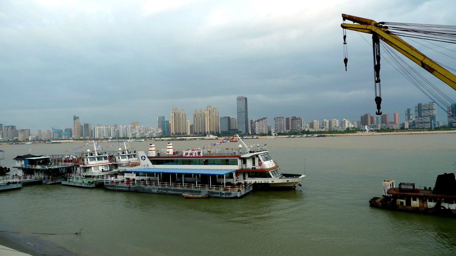 码头上观赏到的两江汇合,远处的黄色江面是长江,近处的清澈江水是汉江