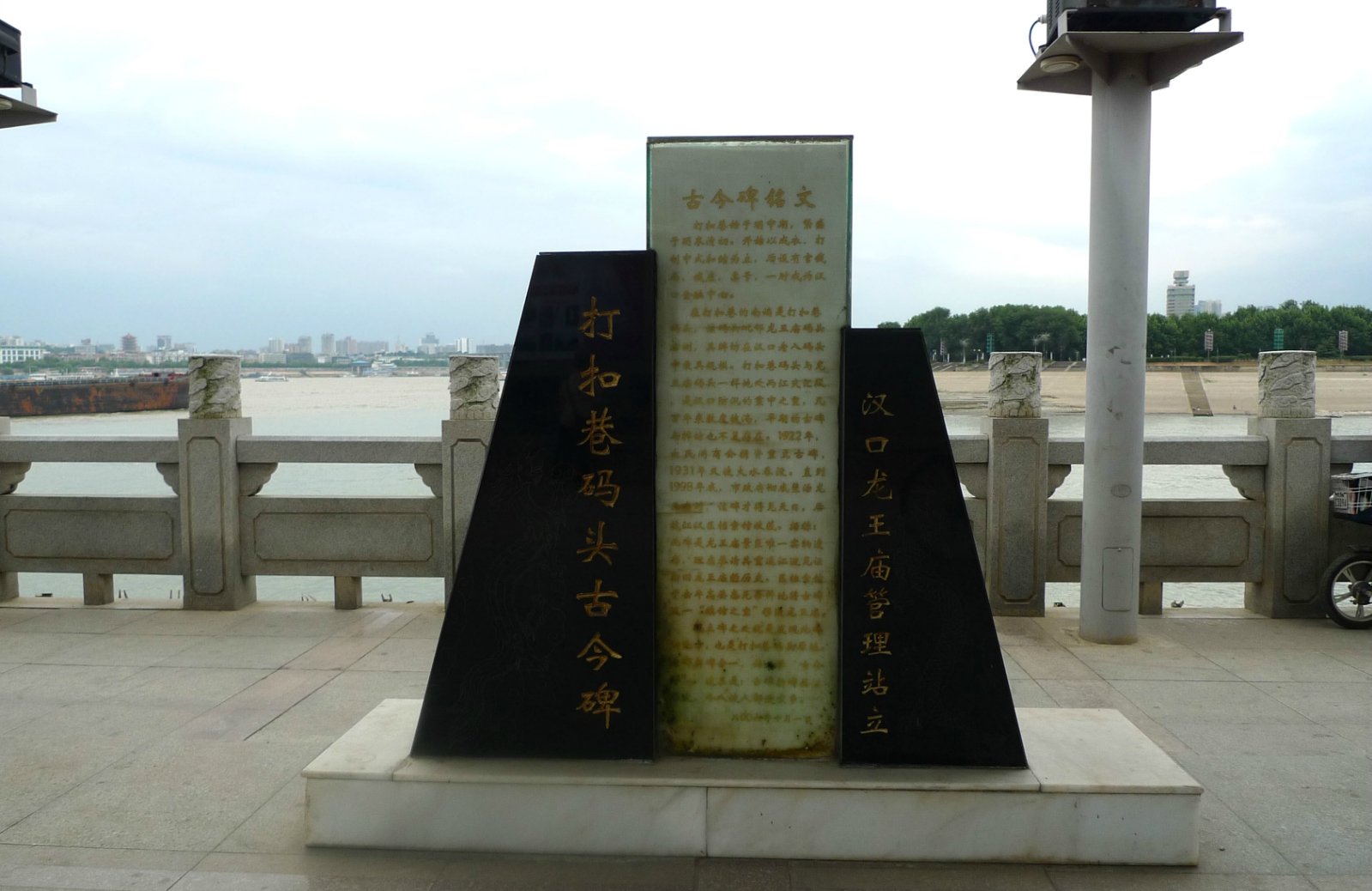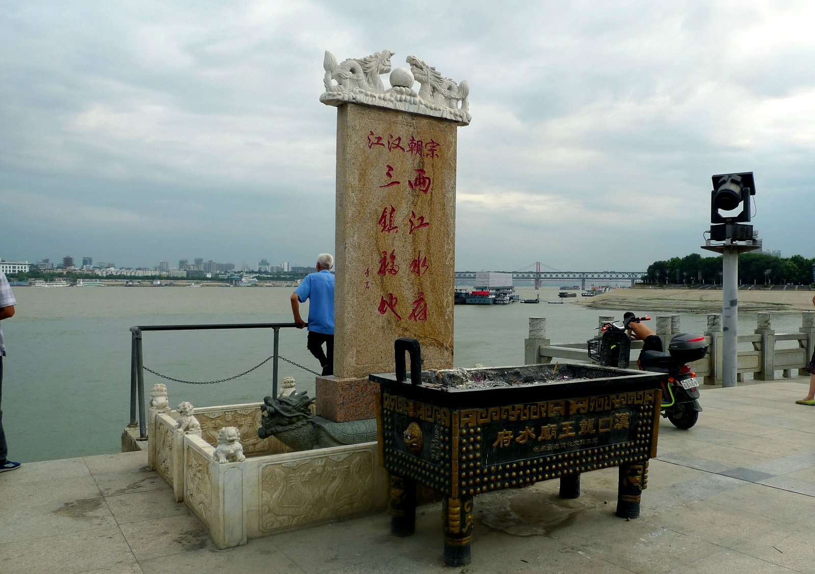 龙王庙位于汉江入江之口(汉口地名的由来),汉江的北岸、沿江大道上,因为两江汇合、水流变幻,容易发生水患,成为传说中的龙王居所,也成为大家来此祭拜的场所。沿江大道靠南临江处就是龙王庙码头,是曾经的打扣巷码头,码头上保留的古石碑就是其见证之一;码头上能够清晰看到对岸汉阳的南岸嘴,南岸嘴一侧是黄色的长江水,另一侧是清澈的汉江水,两种颜色的江水在同一水面交汇,很是壮观。建议大家一定要来码头,观江水、赏古迹、拍美照哟~~~