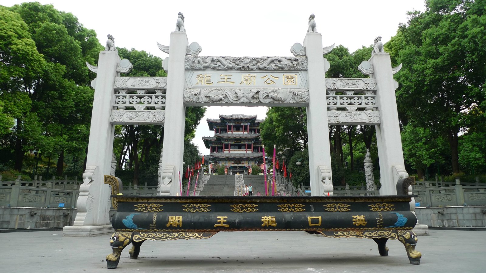码头过马路(沿江大道)就是龙王庙——祭拜龙王的地方,虽为新修的三层阁楼,但是也是一处风景。阁楼建在高高的台地上,可以眺望两江汇流;阁楼内是讲述各类远祖的生平,以及祭拜的场所。整个阁楼四周是个绿化公园,属于免费游玩的场所;象征汉口原点的古井被保留,还在诉说着汉口的起源。