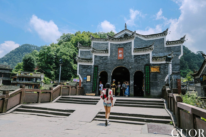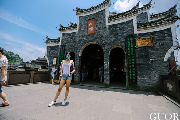 虹桥,原名卧虹桥,建于清代康熙九年,民国三年重修,改名为虹桥。桥有二墩三孔,是用木地红条沙石砌成的石拱桥。原桥面两侧各建有12间吊脚楼木板房,开设饮食、百货店,中间为2米宽的人行长廊。长廊上方建有屋顶,行走廊中,可避风雨,故又称风雨楼。几经拆除兴建,1999年底又重修复了虹桥风景楼,两边仍作为店铺,只是不知当年的风貌,如今又能还原几分。