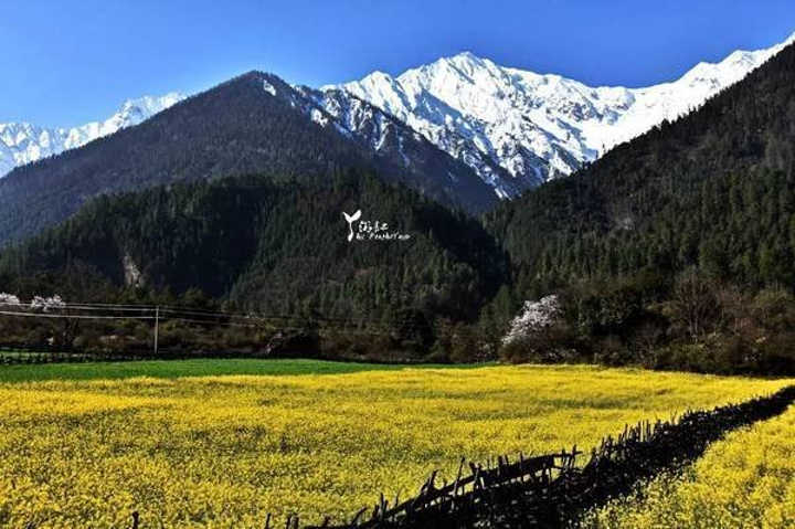 等进到桃花沟了,红蓝相间的屋顶,白色的墙体,与田间黄灿灿的油菜花,绿油油的青稞,还有离不开的雪山环绕,又勾勒出一幅美丽的田园油画,沿着公路都被木栅栏围起来,更像是一幅幅风景被画框定格在了其中。