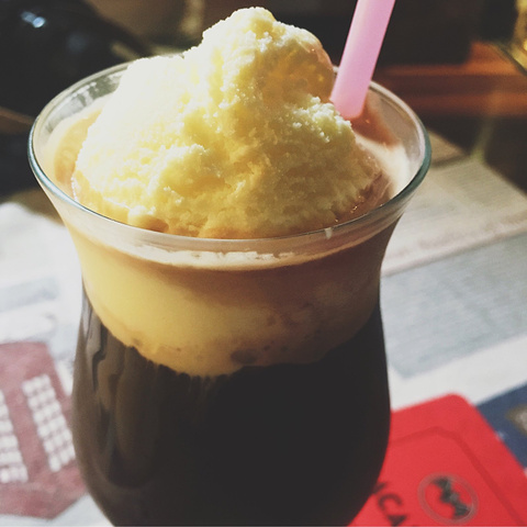 莫里亚蒂和夏洛克。虽然只是加了冰淇淋的美式,可是木质桌椅的沉木香气,丝绒触感的餐前方巾混合着雨水的滴答,没有什么更完美了。