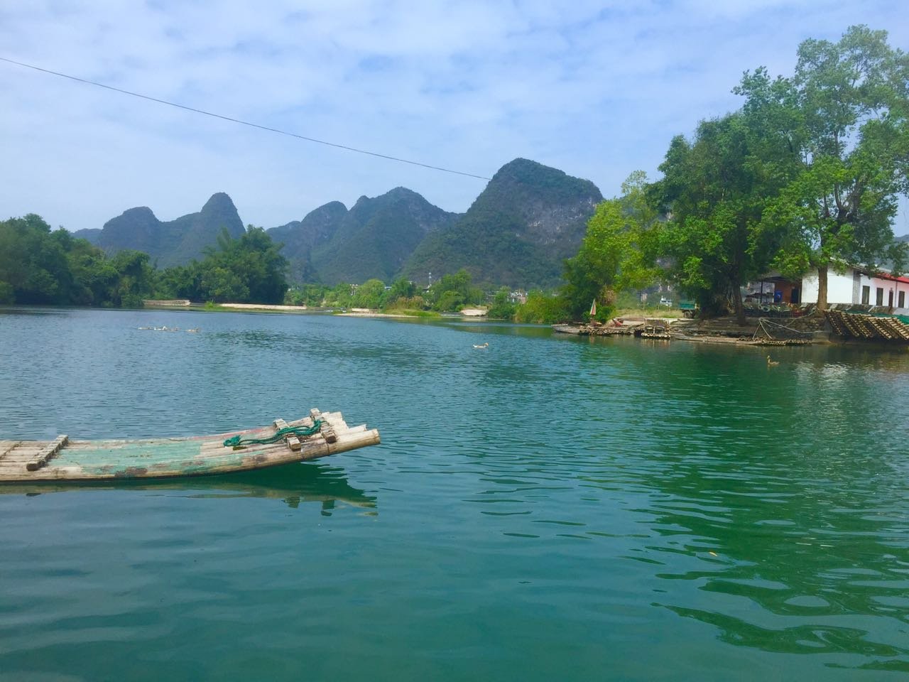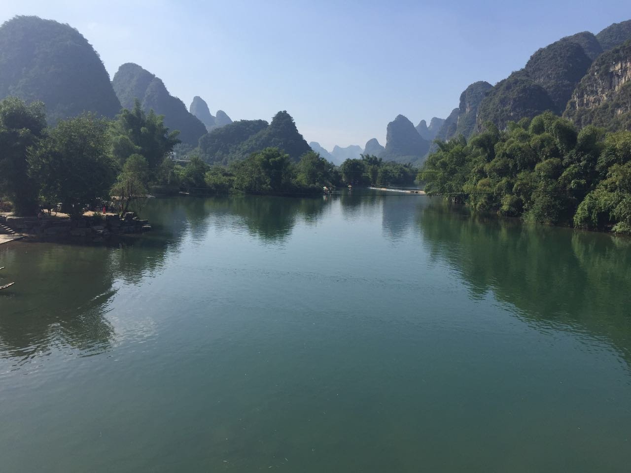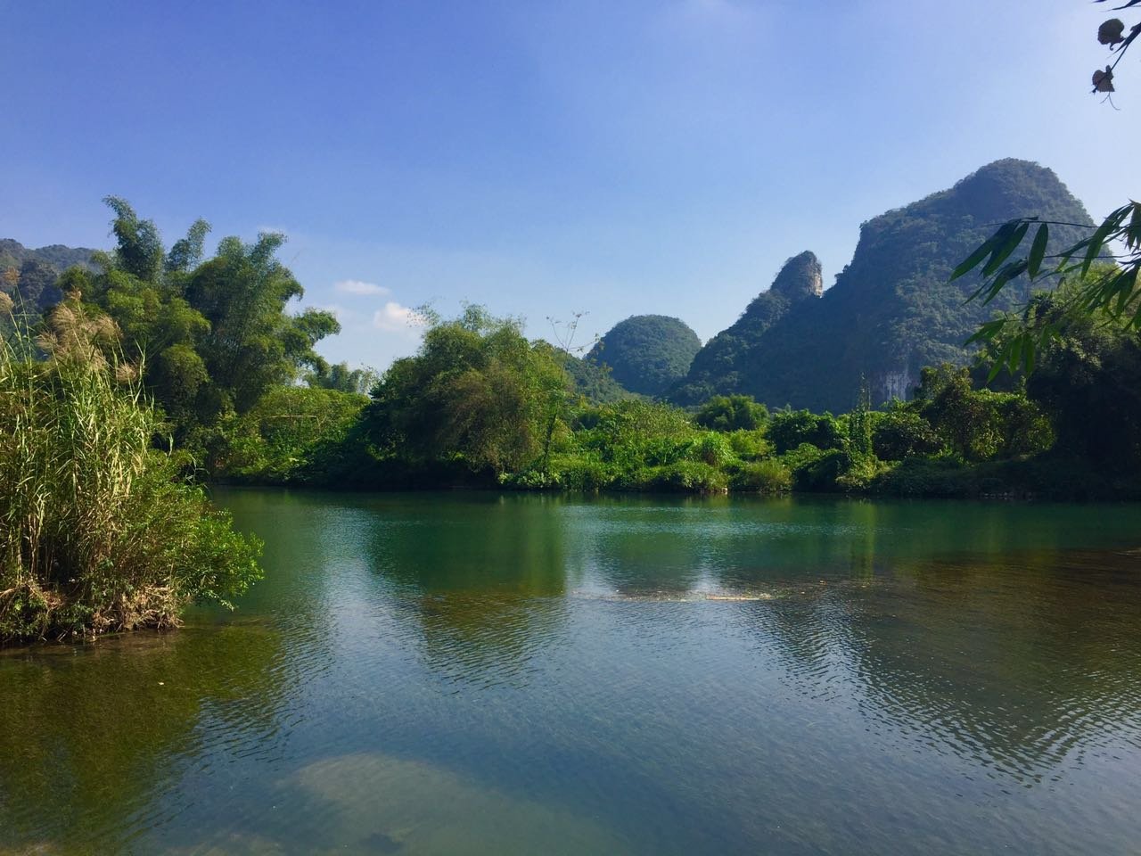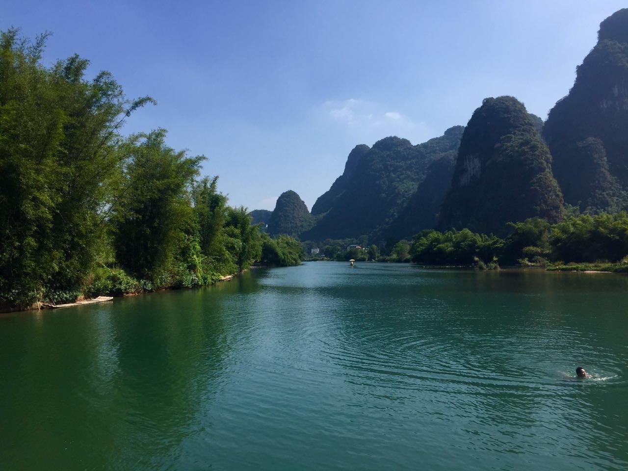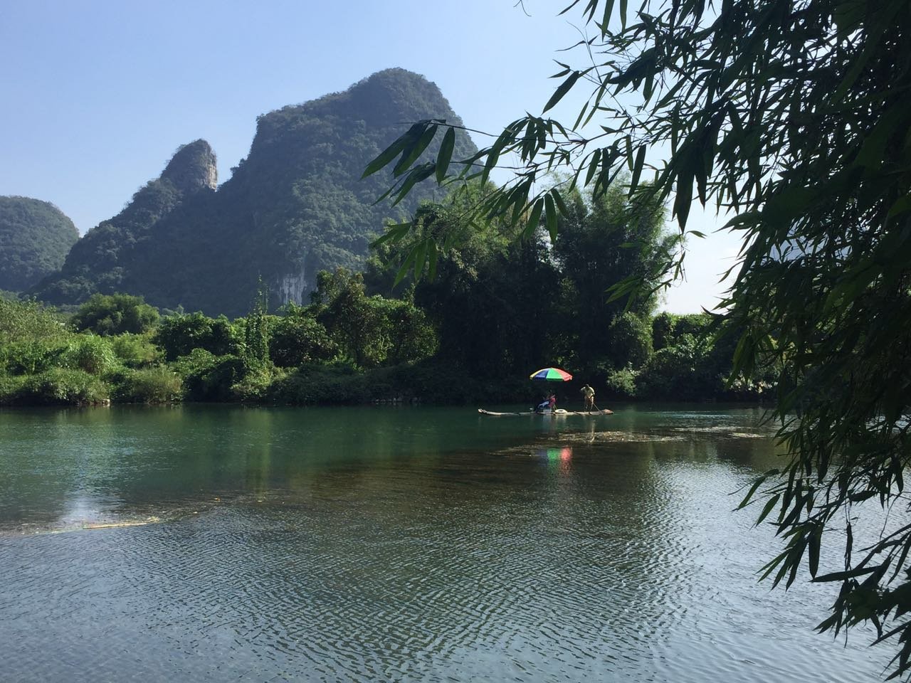 相比漓江的大气奔腾,遇龙河更显妩媚妖娆,其水流缓缓,碧水微澜。两岸山峰对比漓江更加清秀迤逦,仪态万千,河岸树木葱郁,绿草如茵。如果说漓江是交响乐,遇龙河就是江南小曲,漓江是寥寥几笔的淡墨写意,遇龙河就是青山绿水的粉彩工笔。