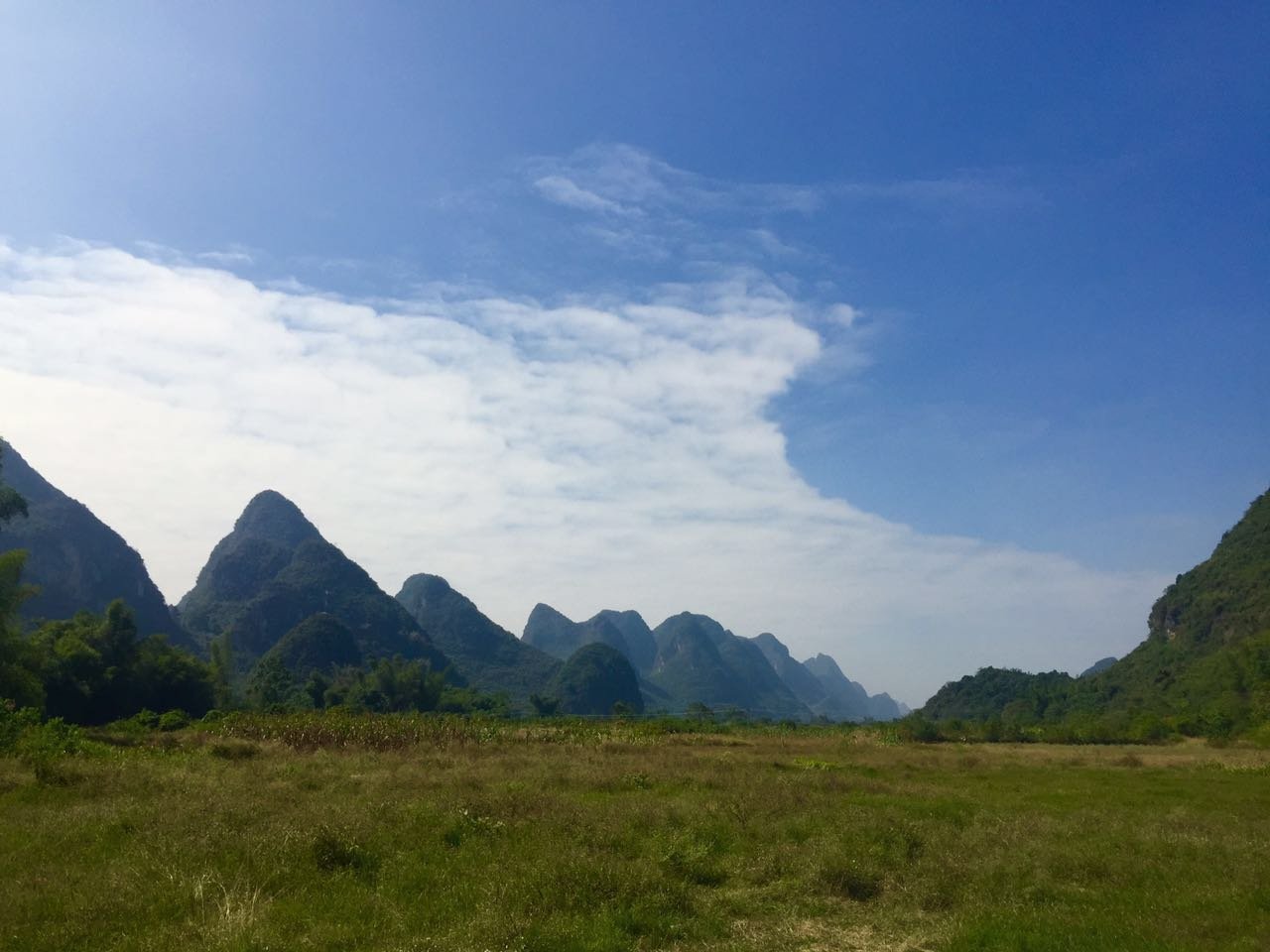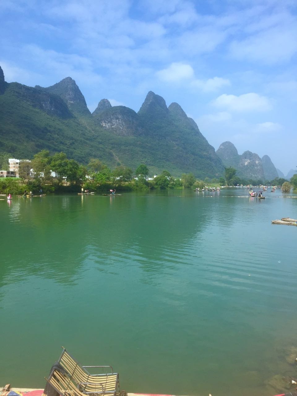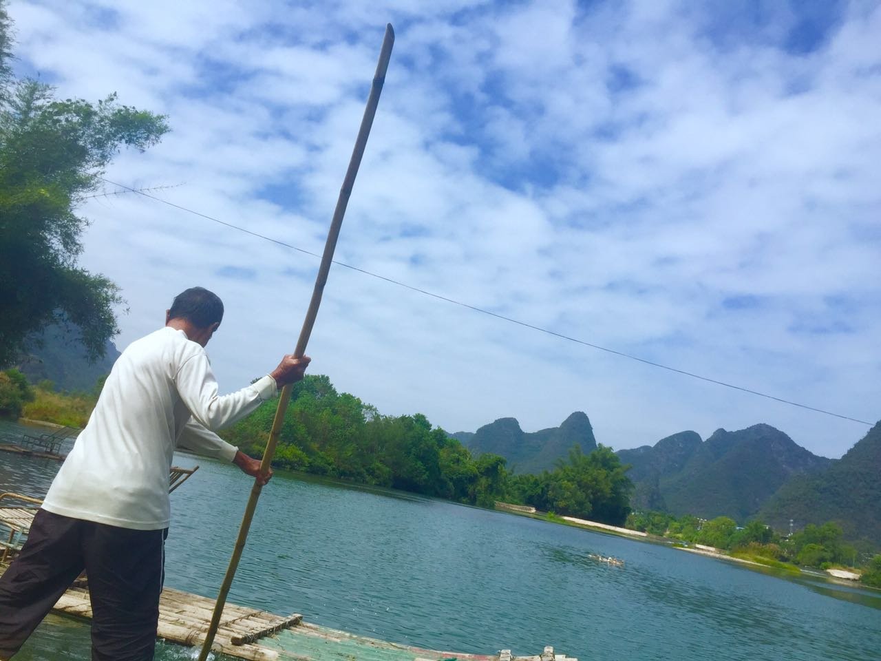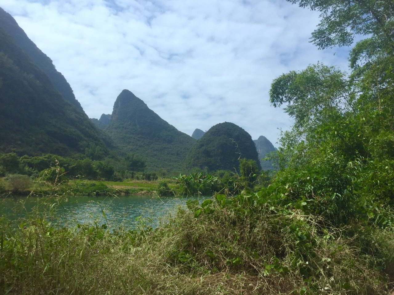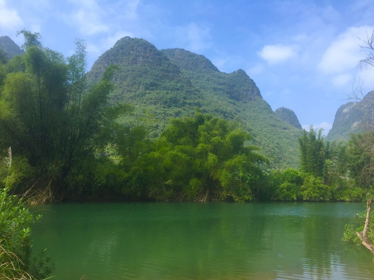 相比漓江的大气奔腾,遇龙河更显妩媚妖娆,其水流缓缓,碧水微澜。两岸山峰对比漓江更加清秀迤逦,仪态万千,河岸树木葱郁,绿草如茵。如果说漓江是交响乐,遇龙河就是江南小曲,漓江是寥寥几笔的淡墨写意,遇龙河就是青山绿水的粉彩工笔。
