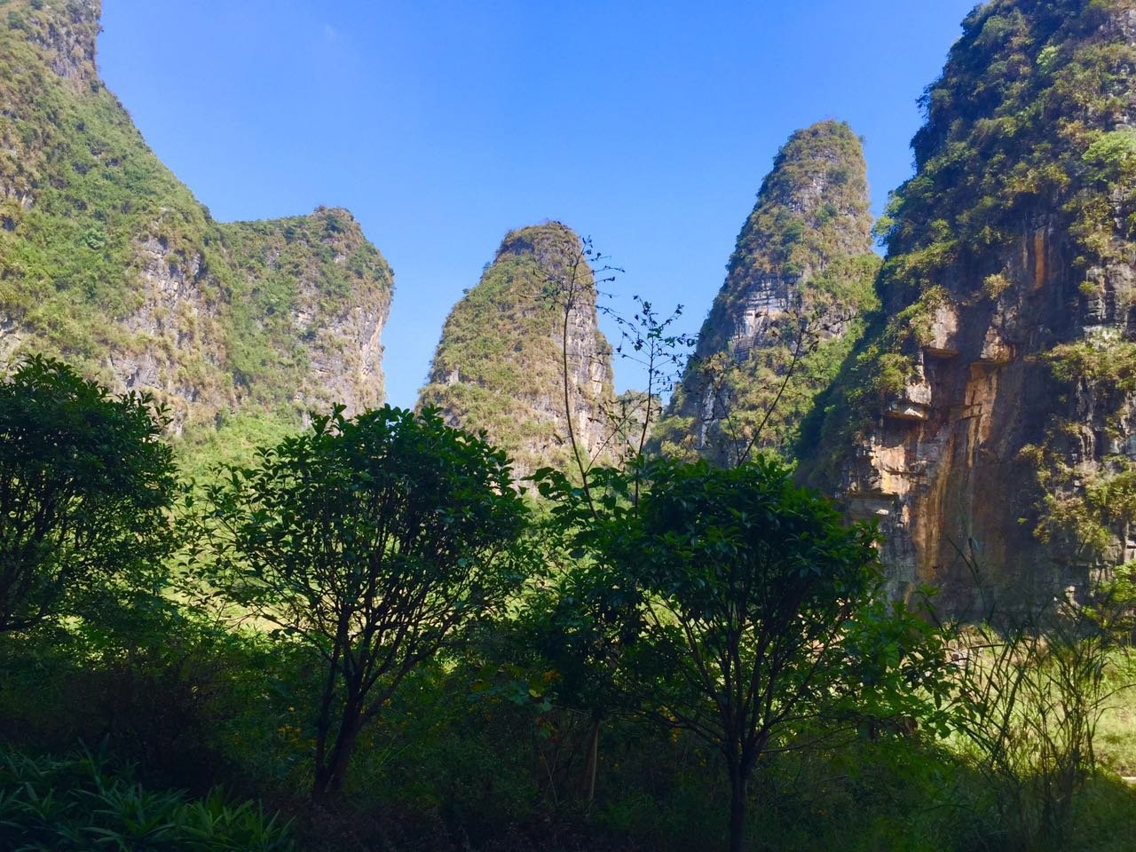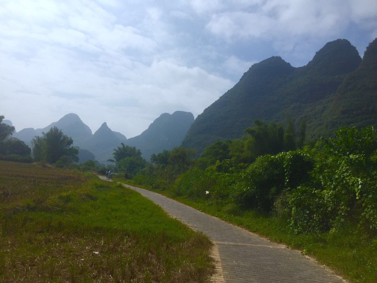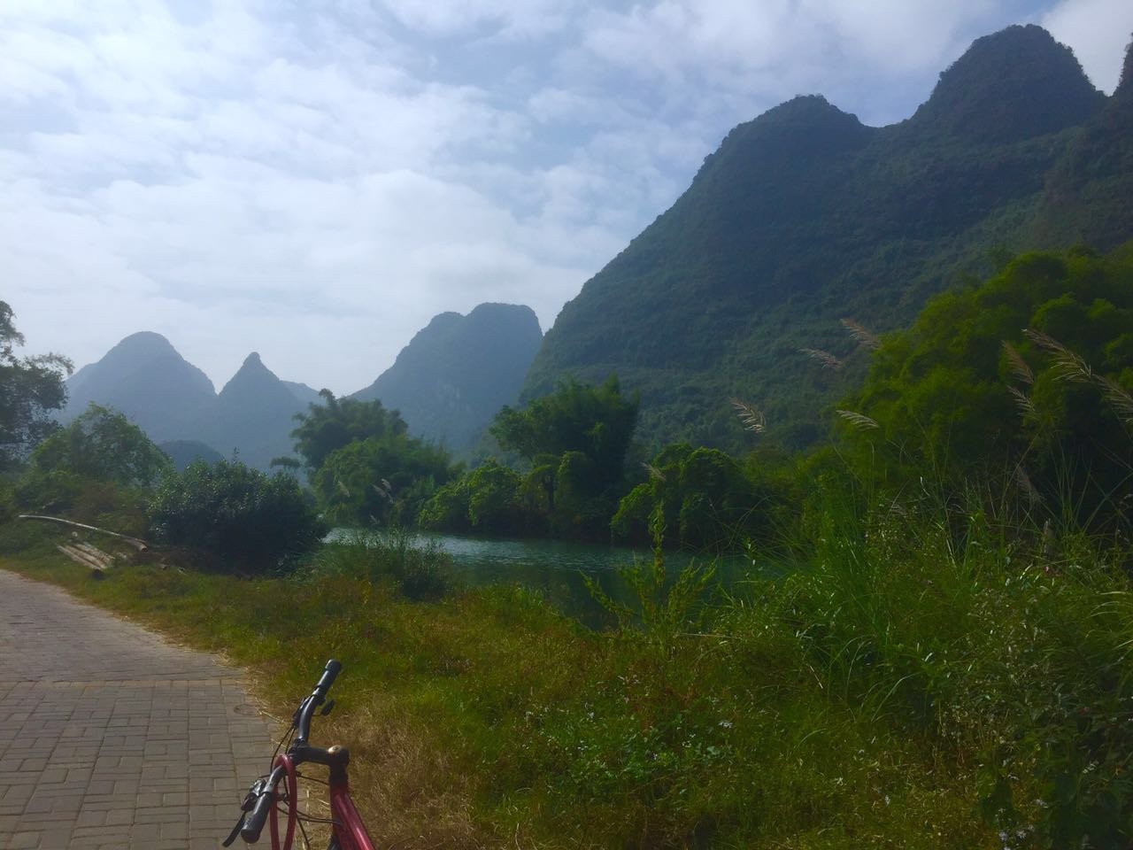 我们第一天晚上怕吵,没有住在西街,选择住在响水路,第二天一早以15元/天的价格租了4辆自行车,沿着一般骑行线路的反方向(正方向的自驾车、骑行车太多)荆凤路向南,到抗战路西拐,一路经过图腾古道、蝴蝶泉、十里画廊、大榕树、月亮山等景区。