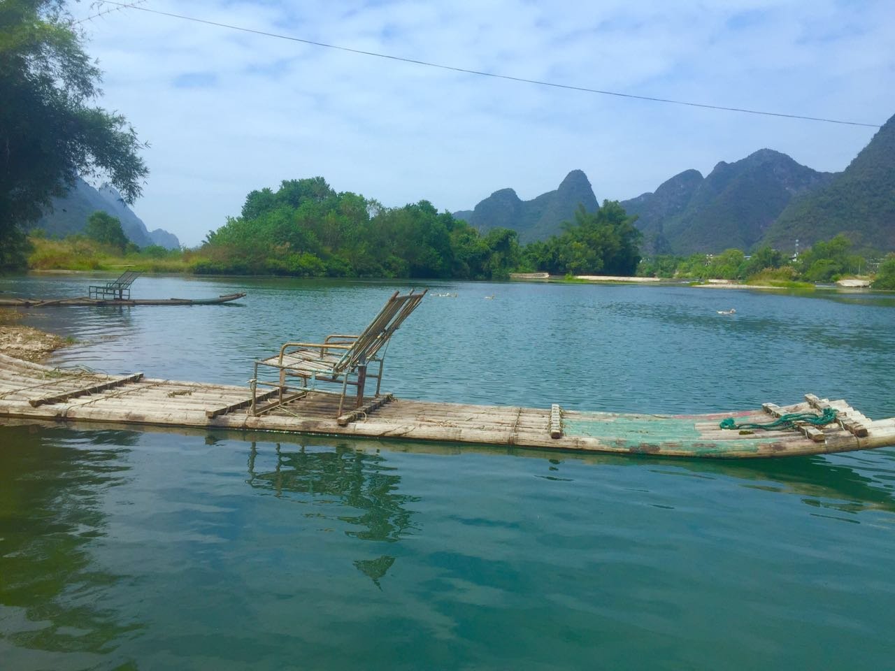 竹筏票提前和某宝买好,然后推着自行车上筏,1艘筏可以坐2个人,每艘筏另多给了60块钱的小费。 如果我们不把车子放筏上,一会漂到下游还要步行5个小时或者租车回到上游,遇龙河处租车30元/天。