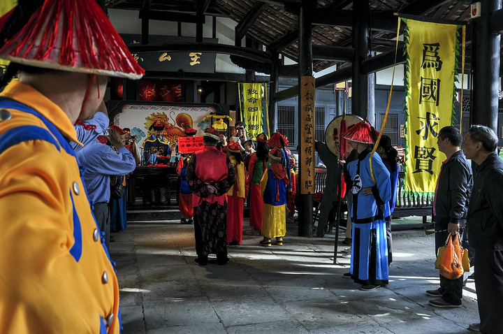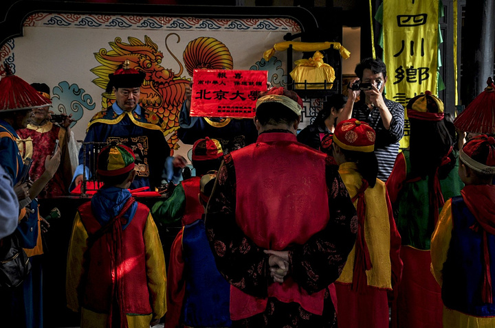 贡院里在进行有趣的表演,游客可以扮作考生,身着清朝官服的考官会颁发录取通知书,一色的清华北...
