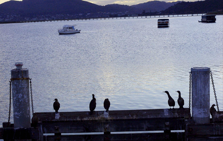 岸边的石墩上整齐的停歇着黑色的野鸭,不时发出鸣叫,似在召唤同伴