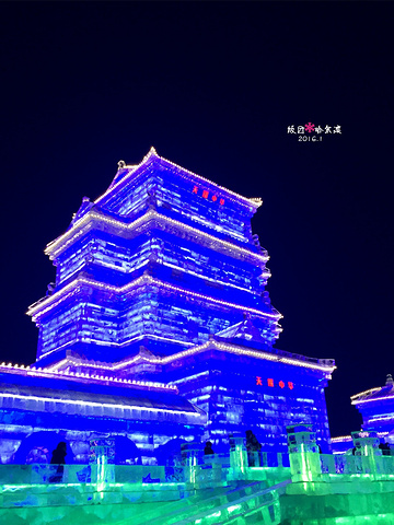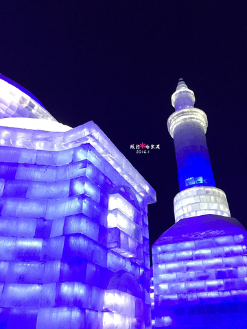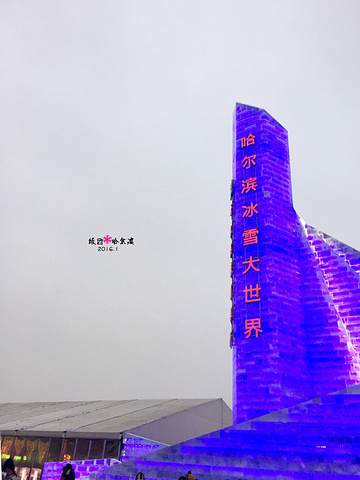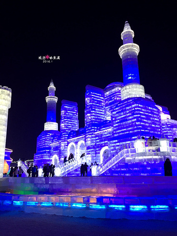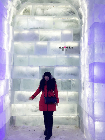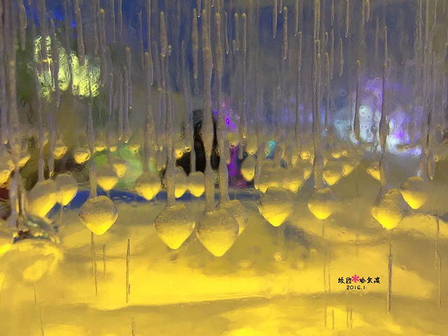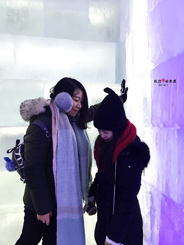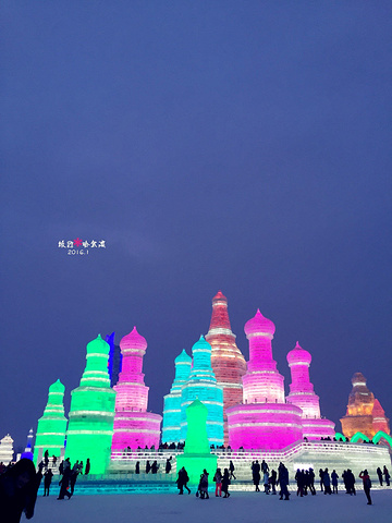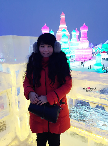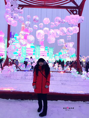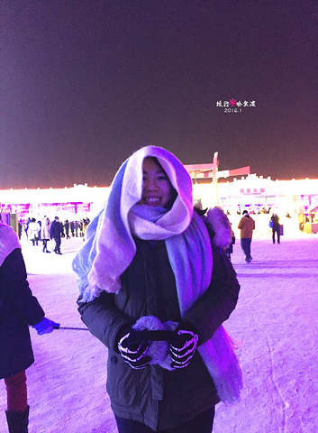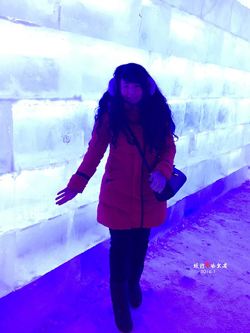 进了冰雪大世界的门,感觉温度骤降了几度,白茫茫的雪地上放眼望去是各种彩色的冰灯,果然是冰雪的世界~就着寒风啃完了速冻的赛百味,开始往里面走。