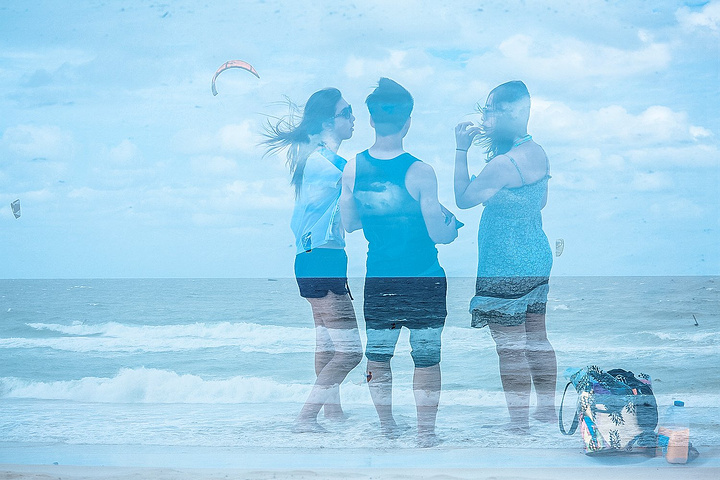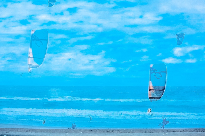 蔚蓝色的海面上,几羽滑翔伞如同绚丽多彩的礼花在海面的空中绽放。 其实这也是哥第一次尝试二重曝光,照片谈不上有意境但特别有意思,二重曝光非常讲究构图创意,一时间也让自己不得其法。不得不说,摄影这东西没用任何捷径,多拍多练多看多学多思。