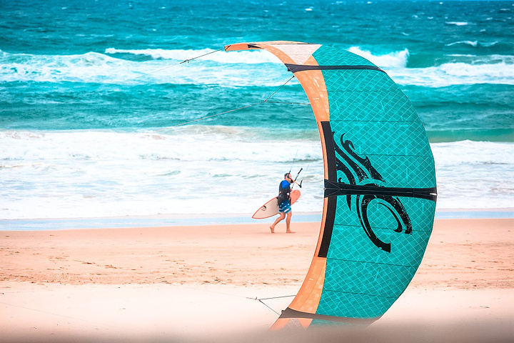 黄金海岸的冲浪跟我想象的有些出入,不是单纯依靠冲浪板,而是滑翔伞冲浪,也称风筝冲浪,是透过大型充气支架风筝连结到人体上并脚踏风筝浪板或冲浪板在水面航行的运动。据说该运动仅发展短短十余年,但却是目前水上运动发展最快的一项运动。
