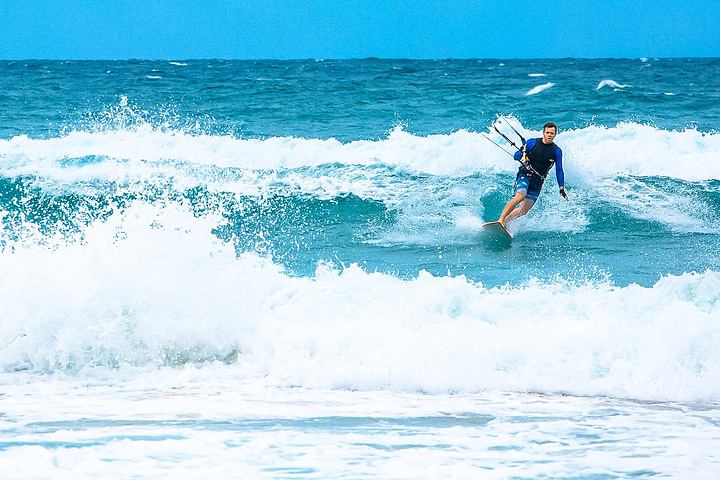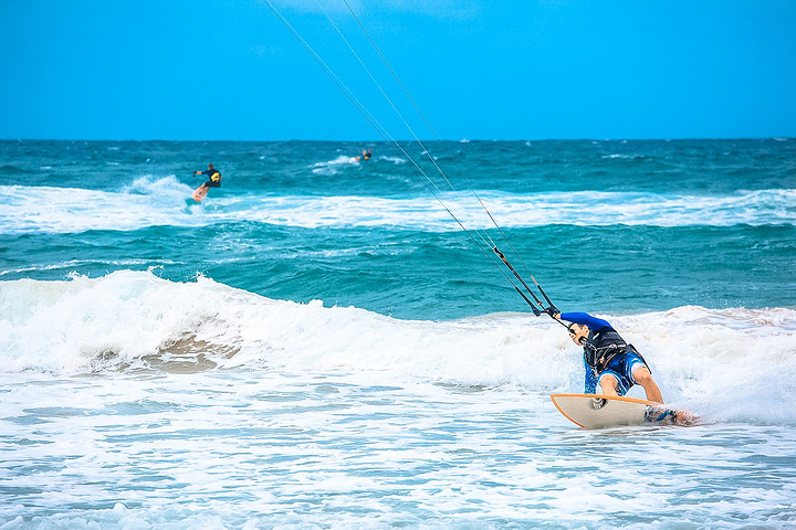 滑翔伞冲浪是航空运动和水上运动的结合,用滑翔伞做动力玩冲浪,透过大型风筝的力量可以有效的带动人体在水面滑行或者飞跃高空。在蓝色无垠的水面上,让浪花扑面而来,借助海浪和风力跳起在空中自由自在停留的一瞬间,体验真正意义上的乘风破浪和凌空鱼跃的洒脱,让自己疾行在汹涌的波涛中寻找属于自己的快乐与感觉。