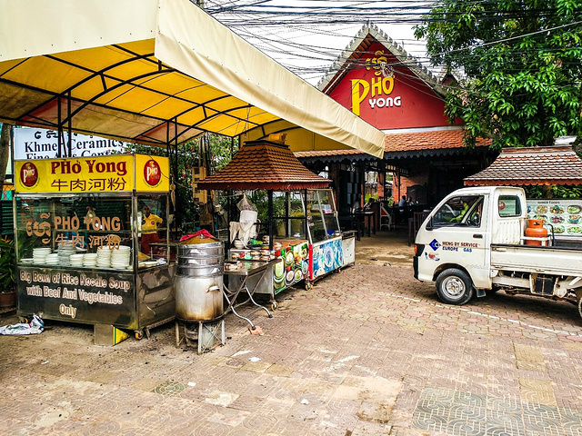 在吴哥博物馆斜对面的马路边上有一家餐馆,叫“pho yong“,看到 phở,就让我们都想到了去年的越南时光,越南河粉真的是伴随着我们的”穿越“之旅,即便是回国了,依旧让我们念念不忘,所以现在必有回响了,在暹粒还能吃到这挂念已久的越南风味。