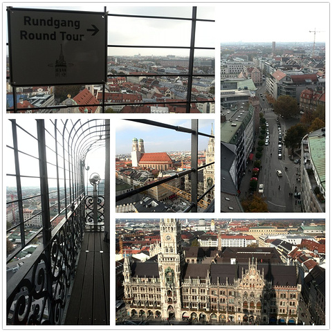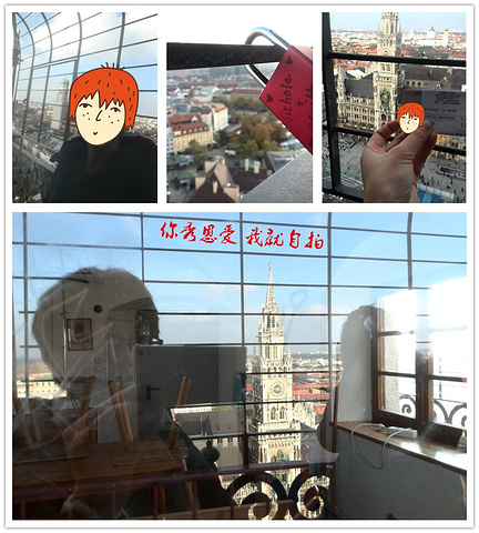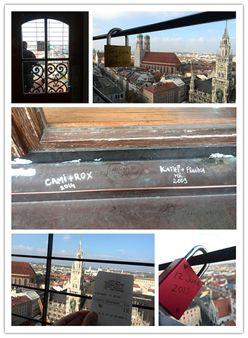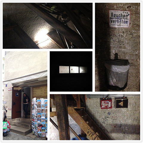 这是这一次旅行的第一声”哇“。售票处就是卖明信片的一个小摊,很不起眼,差点错过。成人3欧可以上楼。说实话,一进门,当时心想”尼马,这么破,被坑了“,内部环境就是国内没人去的木寺庙,楼梯也是破破的黑黑脏脏的,完全不像是一个景点的感觉。然后就是不停地爬楼梯,虽然有点累,但越爬越觉得看到了希望。 终于到达顶楼,心里那个高兴呀。顶楼是一圈环形的,可以绕着走一圈360度看全景的。玛丽安广场和钟楼就在你眼前,好值!