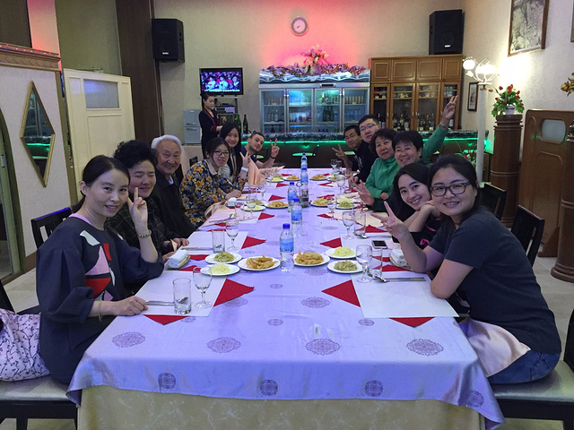 大同江啤酒,或许是水质的原因超级好喝,以致最后一天千辛万苦从平壤背回四瓶。第一顿晚餐。团友合影