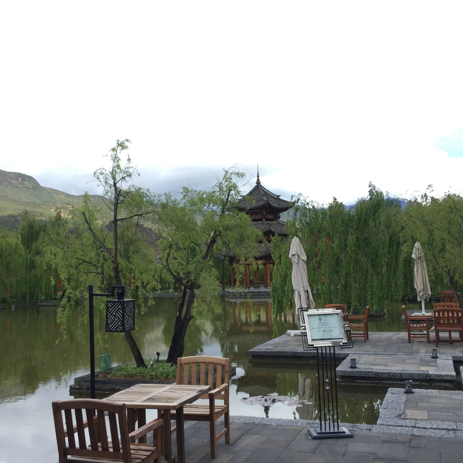 【环境】餐厅的装修设计融合了丽江的山、水、小桥、流水、人家,非常有情调。餐厅分为室内或者室外,如果不怕冷,或者有阳光的早上在户外是非常有氛围的,餐桌旁边的杨柳,丽江的灯具,以及湖里的鱼儿,加上美味的食物。