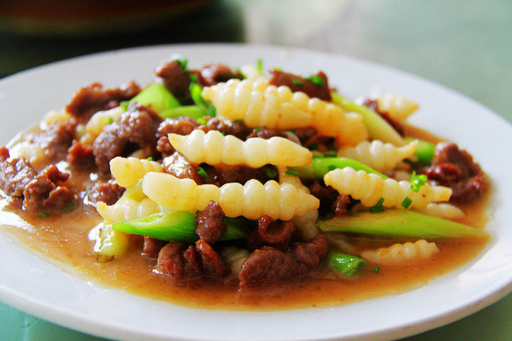 店家推荐野蚕草炒牛肉,光听着这菜名就引发了食欲,有点像肥胖版的冬虫夏草,尝个鲜。