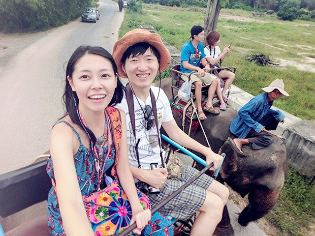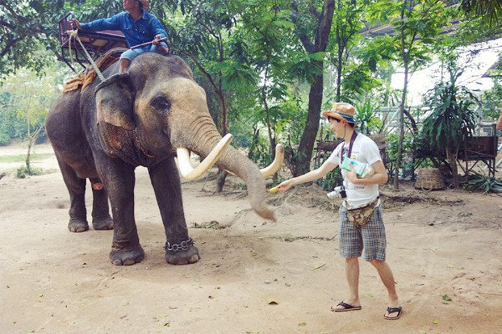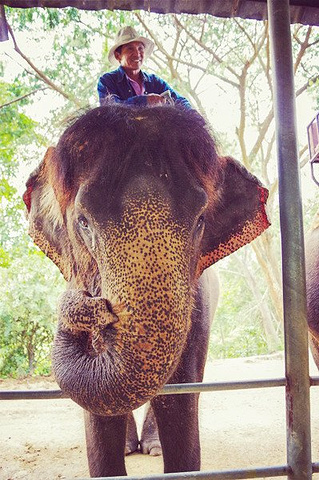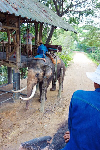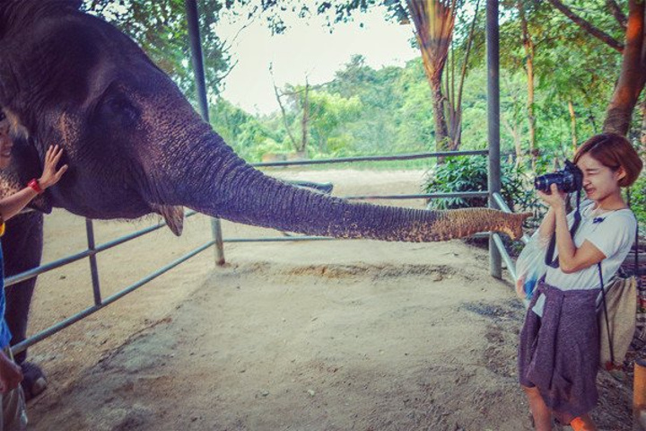 下来后可以跟大象合影,还可以坐在象牙上让大象把你举起来!我发现拍大象必须从侧面拍才更可爱哦!这是别人拍照时我拍的,比正面拍好玩多了~大象伸着长长的鼻子在要香蕉呢~ 下大象后,我们给了师傅100泰铢的小费,虽然没有硬性规定一定要给小费啦~ 一般大家都会给50~100,老公说这样师傅开心了,会给大象好吃的!