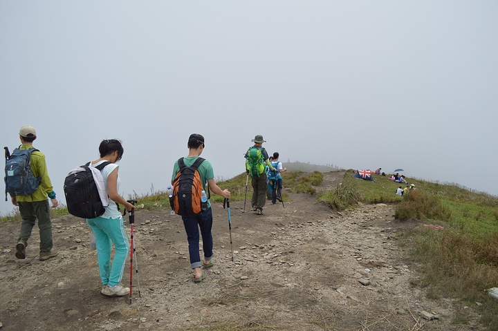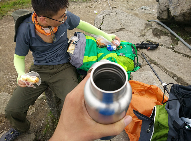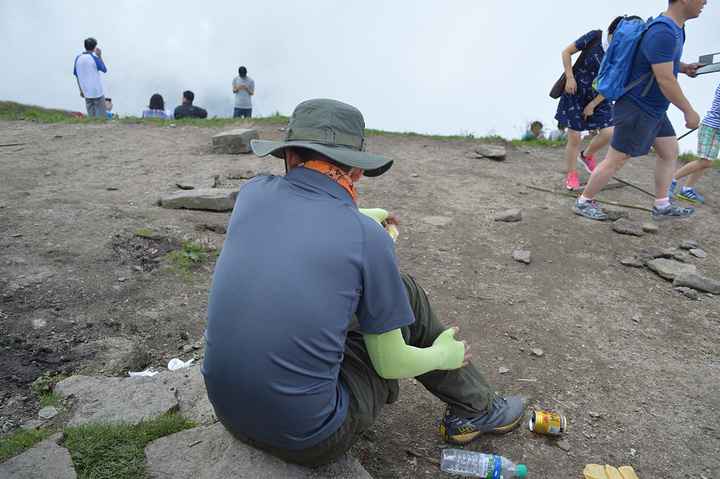 登顶了,比较遗憾的是山上没有什么刻有文字的纪念碑。据说以前有一块写字的石碑,后来被雷劈掉了(此时,天空中传来电气工程师杰少幽幽的声音:“肯定是防雷没有做好”)。 和蜗牛在这里坐下,开始就地进行简单的午餐。吃了一块压缩饼干,又吃了蜗牛给的大火腿,还有两个小面包,喝了一整壶早上从客栈带来的热水。那种感觉真爽,特别是热水,喝起来都停不下来。 蜗牛脖子后面还被虫子咬了一口,好在他早就百毒不侵了…结果虫子估计中毒挂了……