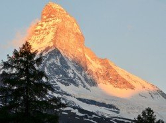 戈尔内格拉特(Gornergrat):单程约45分钟,是马特宏峰地区的标志性景点。 一大早起来从距离采尔马特火车站仅50米的起点站搭上瑞士海拔最高的露天齿轨火车,听说一年四季均可到达戈尔内格拉特,途中无需换车,每个乘客均有座位,开放式车窗,车内配有暖气。 从山下看到山上的雪线分明 雪线下 多是黄色和绿色的针叶松林 雪线上白茫茫。马特洪峰和少女峰不同的是,这里全是坐缆车上山的,登山也是有好几条路线的,听说下午会多云,我果断通过隧道缆车到观景平台。我到的时间不巧,这里属于冬天,很多景点不开放,本打算先去冰川天堂,然后下山后再从另一边登山去看高山湖泊。去之前还笑欧洲游游客拍的湖泊被冻住了,什么也倒映不出来的照片,可是轮到我们了更惨,售票处好心的告诉我们现在湖泊都被冰雪覆盖了,连湖也看不到了…只有等到夏天才有…失望ing。 比起少女峰游客扎推,马特洪峰,我登山的一路上,居然只有我和另一个男生是亚洲人。 晚上回到宾馆 由于海拔问题心跳一直降不下来,脸红红的,一直晚饭快结束才好些了。抬头看着远处,山峦显得静寂,天空中繁星点点,似乎可以听到大自然在呢喃的声音。不知不觉就睡下了,觉很安稳,除了一个梦。第二天八点才醒,打开窗户,对面的马特洪峰被太阳烧着了,黄灿灿的。