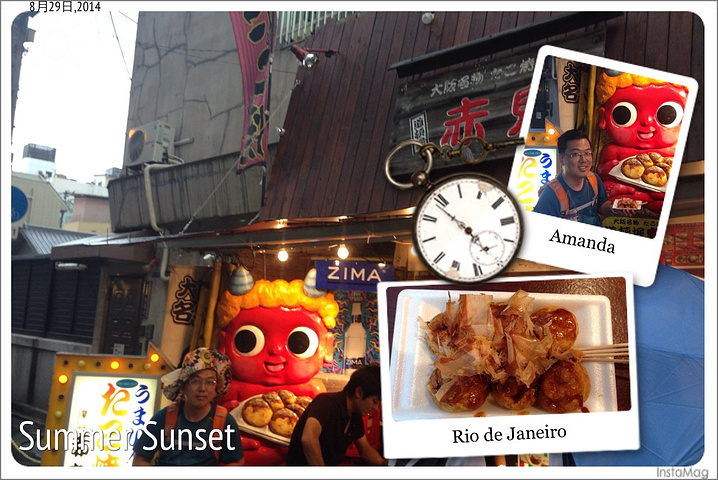 大阪烧: A、推荐一家叫做“道頓堀 赤鬼”的店,看板是一个红红的小鬼孩儿。赤鬼章魚燒人氣最旺。 B、營業時間: 10:00~22:00。 C、現場製作,所以都要等上10-15分鐘喔。6個¥380,8個¥500。¥380 =23RMB,¥500 =30RMB。