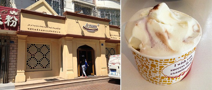 吃饱了慢慢散步回宾馆去,其实哈密市区很干净,道路两边有浓密树荫,非常舒服。 新疆的日头烈,晒起来烤的人晕乎乎的,但是流动的风很是凉爽。 快走回去的时候看到这家“阿依夏木”,我说想吃冰激凌,安安和琪琪陪我一起。 这个冰激凌10元,加草莓什么果子的15元。店里有很多好看的干果和点心,还有自制酸奶。 哈密的酸奶非常酸,可以自己加白糖,直到觉得不酸为止。 曼曼和妹夫新婚燕尔,俩人到小树林去打弹弓玩儿去了