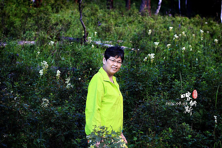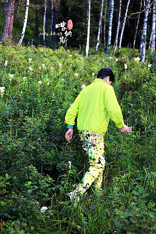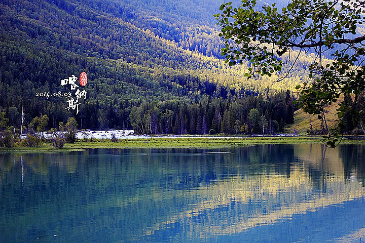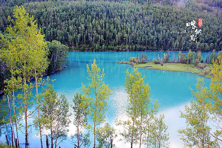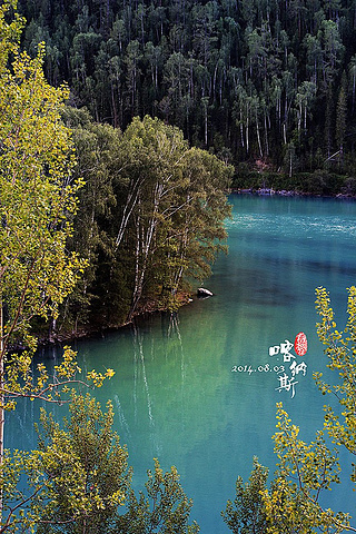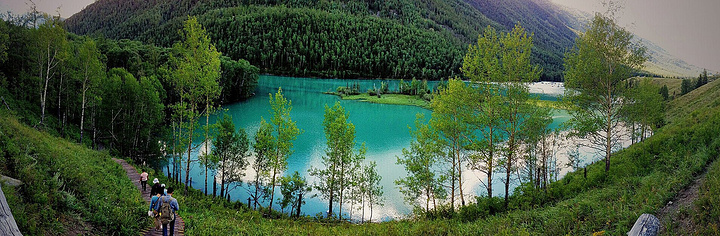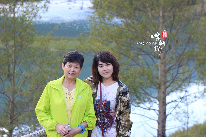 卧龙湾,当地称为卡赞湖,即锅底湖的意思,因其形似锅底而得名。喀纳斯河流经此地,长期侵蚀冲刷而形成的一连串曲折的河湾,又因形似蛟龙盘卧嬉水而得名“卧龙湾”。 我们来到此处时阳光耀眼,又是个大逆光,站在站台上看它,实在看不出真容。 于是我跟老妈说反正这是最后一个景点了,下一站就出去了。 不如下到湖边去玩好不好。 老妈赞成,于是沿着栈道台阶往下走。