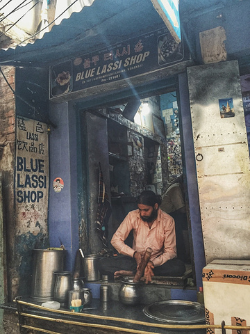 blue lassi,当地最有名的酸奶店,就在老城巷子里,google map可以直接搜索到。你说好巧不巧,前一晚为我们赶走流浪汉,认为我们要去找酸奶店,告诉我们已经关门,为我们指路的小哥,居然是蓝色饮品店的店员,第二天见到他,他热情打招呼,说欢迎,真是美好的遇见。 酸奶的口味太多了,而且一份量比较大,吃完很饱,建议别贪心点很多口味,不然吃不完店家会认为酸奶做的不好吃。(题外话:在印度吃东西最好不要留盘,都吃得干干净净是对店家的尊重,因为如果留盘,店家会自责,觉得是自己做得东西不够好吃或者服务不够好,才会导致顾客不够喜欢,不吃完。所以点餐时应该询问或者观察分量的多少,避免因为便宜点很多而堆积浪费,对食物的不尊重,毕竟粒粒皆辛苦嘛。)印度人喜欢问你:U happy?不管是吃饭还是住宿,得到你肯定的回答就会很开心,是不是很单纯。