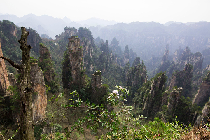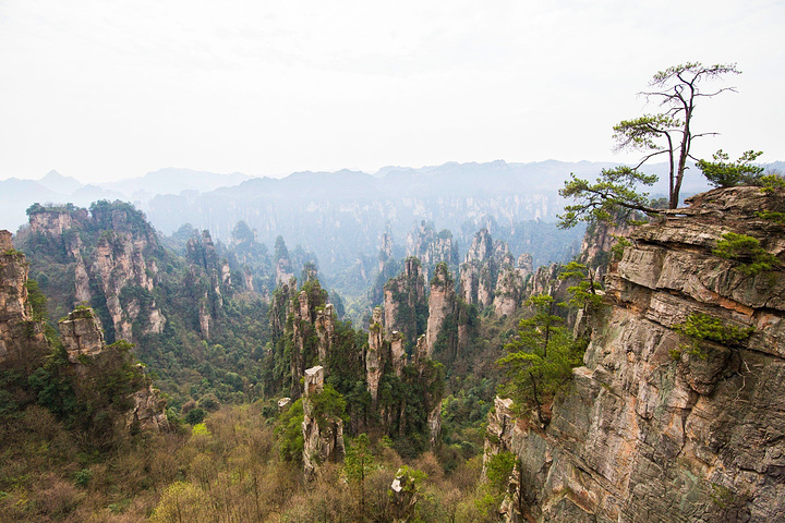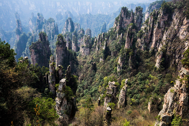 云青是贺龙将军的字,通向云青峰林的小道位于面对贺龙塑像站立的左手边。我们跟着人流快步走过去,看到了天子山景区的精华部分——云青峰林。相比于其他角度其他景点,这里的山峰形状是最好看,最壮观,最令人难忘的。