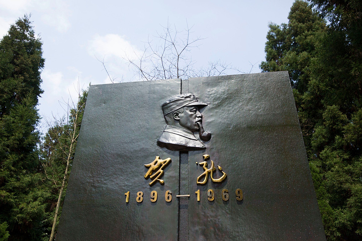 {第二站}贺龙公园 顺着指示牌往前走, 我们到了贺龙墓。不远处就是游客喧嚣的贺龙公园。与贺龙公园相比,这里寂静无人,唯有松针掉落在地的声音。阳光一缕一缕透过疏枝照射下来,让人感到心灵安宁。我们在这里小坐了一会,就转道去了贺龙公园。这座公园为纪念贺龙元帅转战天子山而建,特色在于我国近百年来设计和铸造最大的一尊铜像――贺龙铜像,高6.5米、重9吨多,包含了贺龙将军的三宝:战马、军大衣、烟斗。战马已经被摸得闪闪发亮,我们听导游讲述了贺龙将军的生平,便沿着小道去了云青峰林。