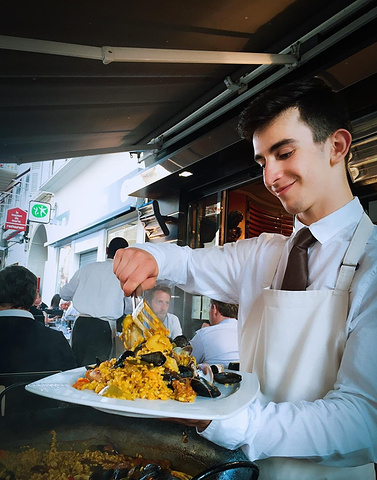 他们家的pella 也是一绝~66欧一盆,至少有四人份。巨大一个锅,我和一号都惊呆了。隔壁夫妻看了哧哧傻乐,开心地问我,这么多你们吃得完吗? 吃不完?我哈哈一笑,放下查着攻略的手机,打包呀~这可是一个很罕见的可以打包的法国餐厅呢~ 藏红花烹制的米饭,里面有大量的鱿鱼、虾,但最多的事青口,和不要钱一样的大量青口。 但是我们没有点广受好评的马赛鱼汤,一是找不到,二是穷… 一个很帅很可爱的小哥服务生非常热情地为我们服务,他帮我们分了盘子,笑的特别甜。旁边一个服务员小哥起哄,怂恿我们一起合影,可惜我怂了,只留下小哥独照一张~