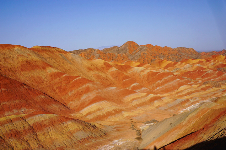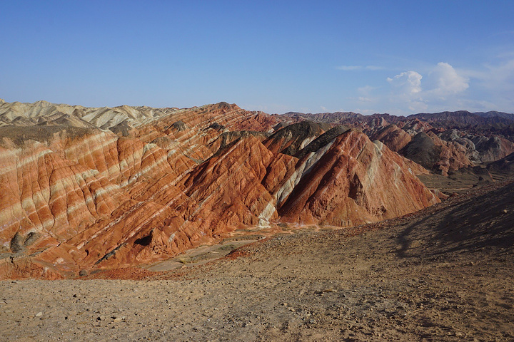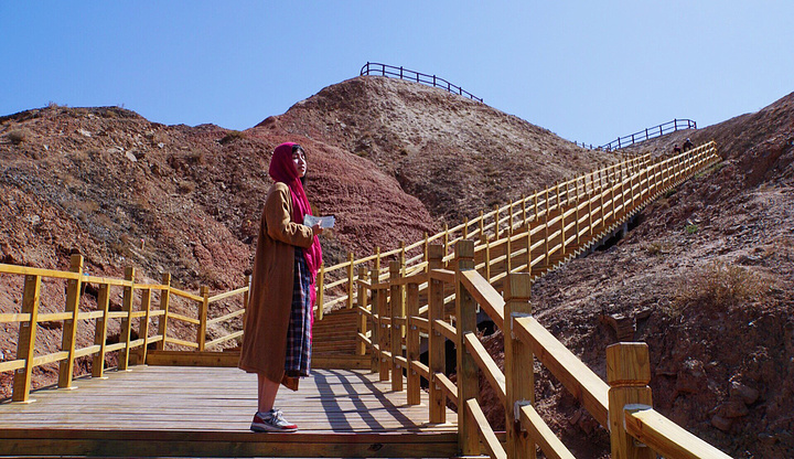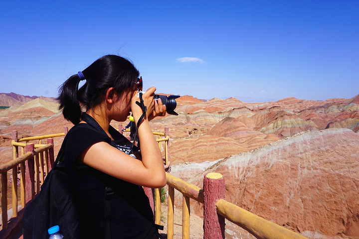 关于观赏张掖丹霞的小建议:1号5号观景台(4号和5号看到的都是刀山火海,但4号能看到全貌;而5号则距离更近,全景和特写的区别。)最佳日出欣赏点:4号5号。最高点欣赏点:2号观景台,爬上去要20分钟,能看到全景。最火红丹霞:3号,3号看到的那座山丘主色调是红橙黄,必须是傍晚的斜阳照射下最漂亮!(若上午去背光,色彩差很多!)从2号观景台下来后,有另一条栈道可以直接通往3号观景点,一路都可以看着这抹火红!麻子面馆:从5号观光点可自行步行前往。来回+拍照大约15-20分钟 下午去了丹霞地貌奇观,在门口买了一条丝巾,买了一瓶水就进去了。奇热无比,一瓶水很快就喝完了,找了半天居然没有卖水的地方。小霸王说喝厕所的自来水吧?我说不好吧!我们去下一个看台,到了下一个还是没有,我和小霸王渴到走不动路,人还在冒汗,口干舌燥。我说:走!厕所喝水去!于是就有了这一张,所以大家已经记得多带水。