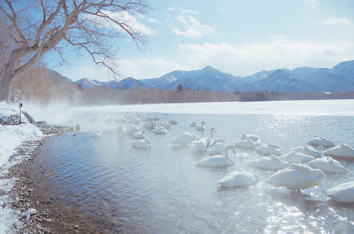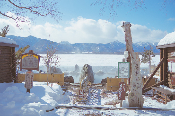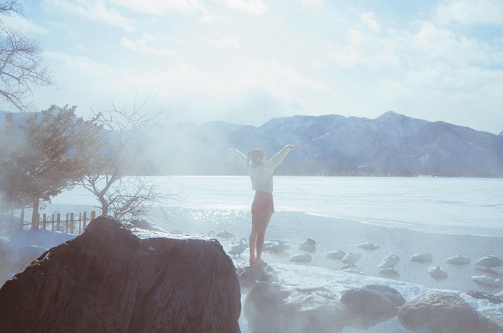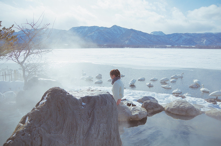 下一站,古丹温泉。 古丹温泉隐蔽在屈斜路湖东南角,是个人迹罕至的露天野温泉。下车后往里步行几十步走到湖边,才能看见紧挨湖畔用石头搭建的露天浴池。浴池中间用一块大石头隔开男女部分,简易的更衣室和粗糙的木质围栏反到与周围的景致完美融合,根本就是纯天然无添加啊!放眼四周是皑皑白雪的湖面,绵延的山脉,近处有天鹅作伴,坐拥良辰美景呢~