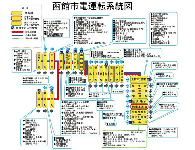 今天住在汤之川,离十字街蛮远的。 退房的时候就顺手在前台购买了函馆市电一日pass,可以一天内不限次数地乘坐。 市电只有蓝色和红色两条路线,分别是2路和5路。 从上图可以看出从十字街到汤之川两条线路其实是重合的,从十字街才开始分叉,所以在那之前无论乘坐哪路都是可以的。