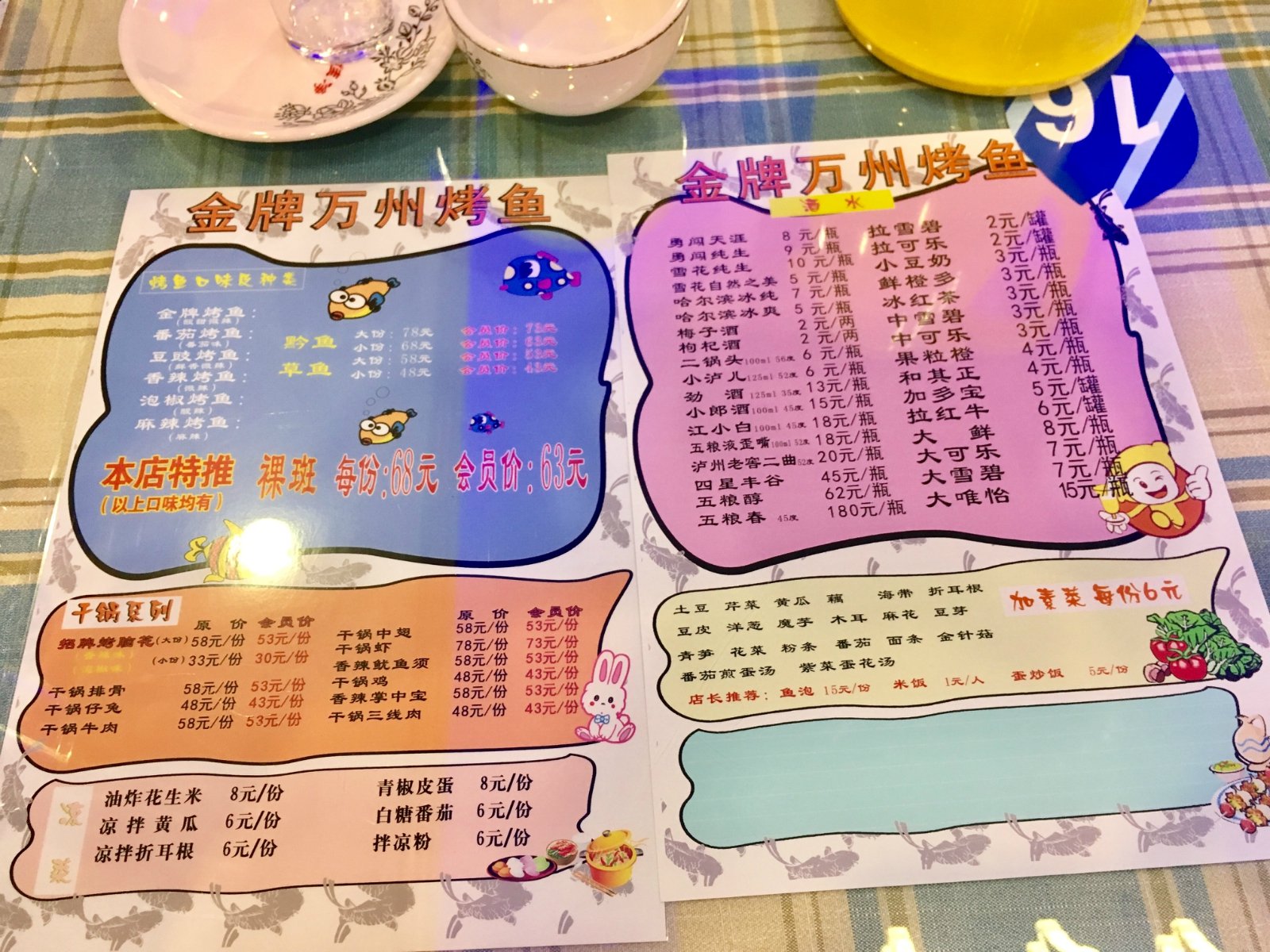 【概况】:“金牌万州烤鱼(隆府店)”的面积并不大,但是环境优雅,很温馨。烤鱼系列的特色菜有金牌烤鱼、豆豉烤鱼、泡椒烤鱼、麻辣烤鱼等六种,黔鱼(大份78元,小份68元),草鱼(大份58元,小份48元),各种鱼的差别较大,黔鱼的肉嫩且刺少,草鱼的肉较糙刺多,店家考虑得也很周到,各种烤鱼的辣度也有差别,我个人还是觉得麻辣烤鱼吃的比较尽兴而且烤鱼更加入味;上一次来吃的豆豉烤鱼味道也很好而且不辣,对于不能吃辣的朋友来说也是一个很好地选择;除此之外还有干锅系列和小菜、饮料。他们家的烤鱼总体上来说不是很辣,哪怕是点了泡椒和麻辣烤鱼都比其他家的辣低一个档次。从分量上来说,这家店非常有诚意,鱼大而且附加的素菜品类丰富,一份大份烤鱼可以满足2—3人食用,如果人多的话再点几份素菜就好。对于这家的干锅系列来说,我觉得味道不是很好,肉不怎么入味而且分量少,远远比不上周边的一些干锅店。另外,这家店的上菜速度有点慢,各位吃客要耐心等待。人均50元/人。