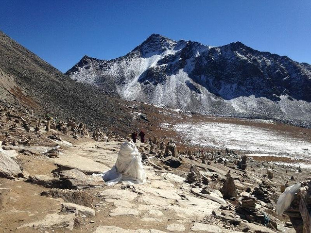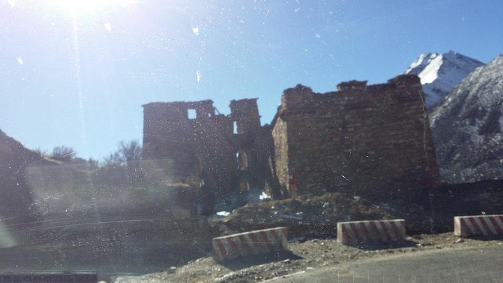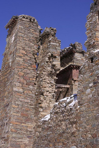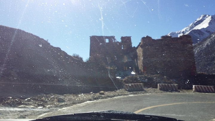 山脚下一处破败的墙体指示牌写着琼果杰寺。一边残垣断壁。