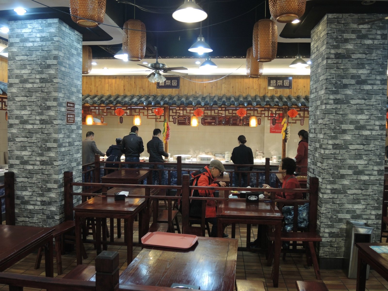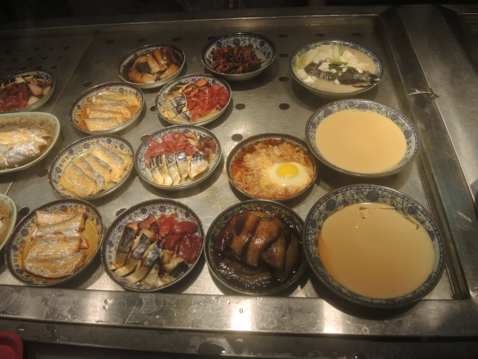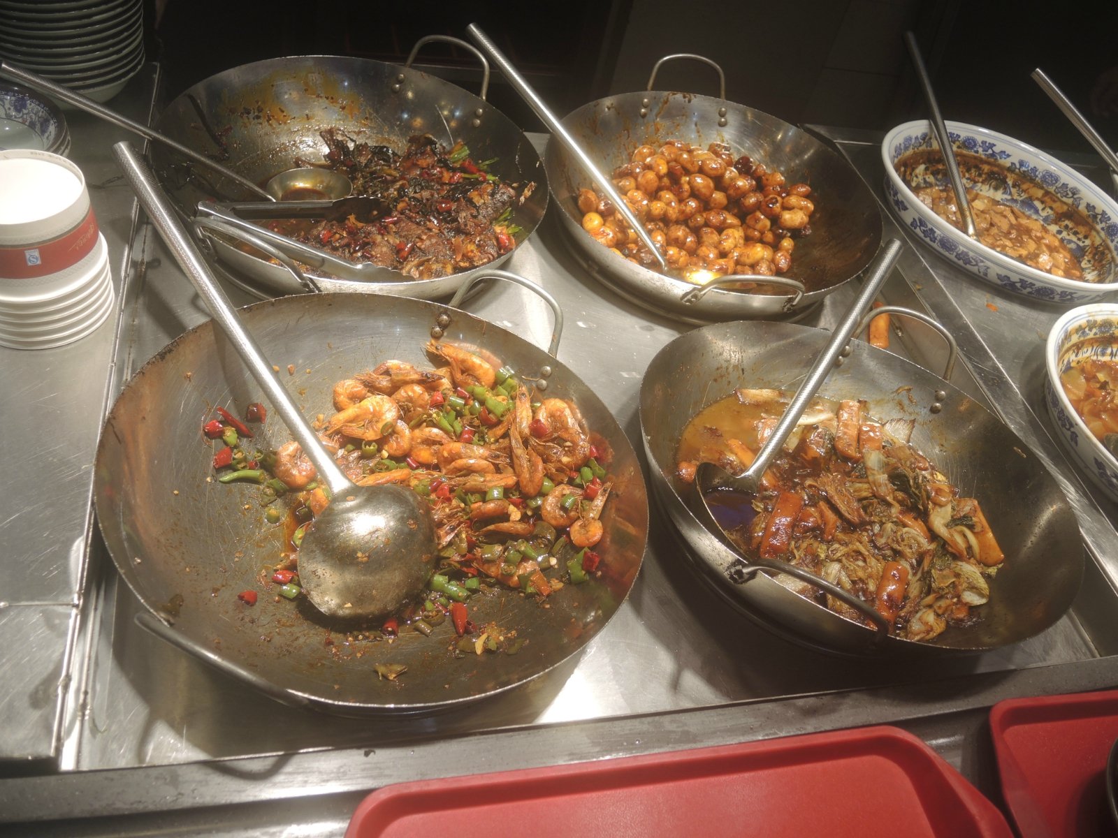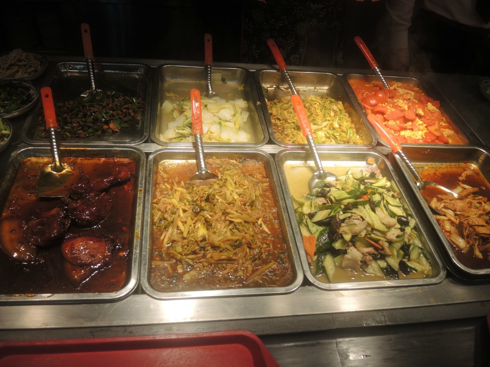 “新四方大食堂”里的环境还不错,大厅很宽敞,周围一圈是用来摆放食物的餐台。这里实行的是自选式购餐方式,我们领了餐盘,到餐台前排队选取食物,最后在餐台出口处结账。